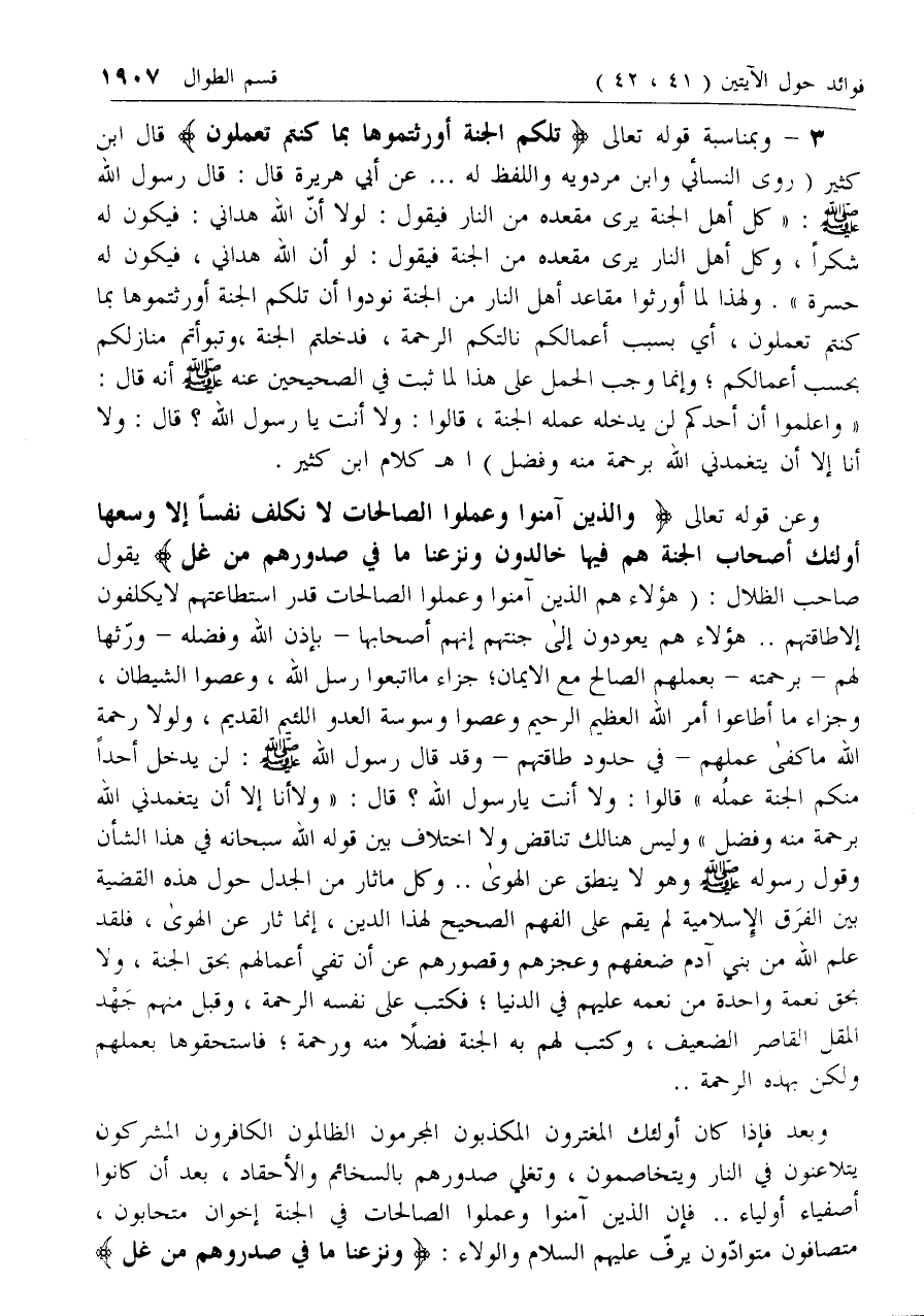 3 - وبمناسبة قوله تعالى تِلْكُمُ الْجَنَّةُ أُورِثْتُمُوها بِما كُنْتُمْ تَعْمَلُونَ قال ابن كثير (روى النسائي وابن مردويه واللفظ له ... عن أبي هريرة قال: قال رسول الله صلى الله عليه وسلم: «كل أهل الجنة يرى مقعده من النار فيقول: لولا أن الله هداني: فيكون له شكرا، وكل أهل النار يرى مقعده من الجنة فيقول: لو أن الله هداني، فيكون له حسرة». ولهذا لما أورثوا مقاعد أهل النار من الجنة نودوا أن تلكم الجنة أورثتموها بما كنتم تعملون، أي بسبب أعمالكم نالتكم الرحمة، فدخلتم الجنة، وتبوأتم منازلكم بحسب أعمالكم؛ وإنما وجب الحمل على هذا لما ثبت في الصحيحين عنه صلى الله عليه وسلم أنه قال: