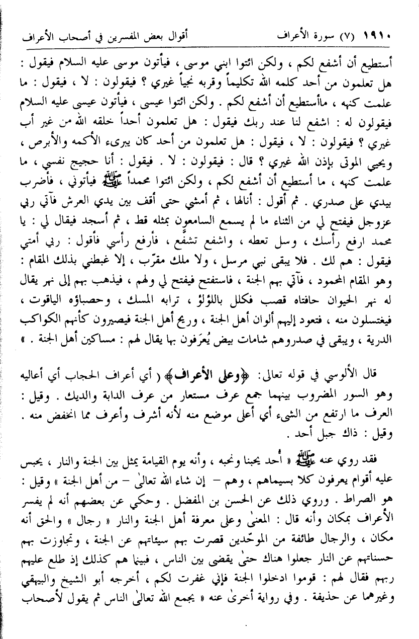 قال الألوسي في قوله تعالى: وَعَلَى الْأَعْرافِ (أي أعراف الحجاب أي أعاليه وهو السور المضروب بينهما جمع عرف مستعار من عرف الدابة والديك. وقيل: