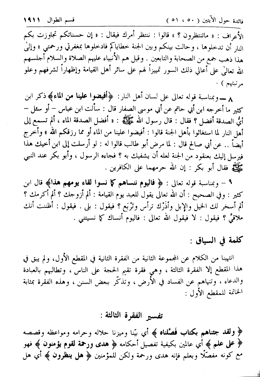 8 - وبمناسبة قوله تعالى على لسان أهل النار: أَفِيضُوا عَلَيْنا مِنَ الْماءِ ذكر ابن كثير ما أخرجه ابن أبي حاتم عن أبي موسى الصفار قال: سألت ابن عباس- أو سئل- أي الصدقة أفضل؟ فقال: قال رسول الله صلى الله عليه وسلم: «أفضل الصدقة الماء، ألم تسمع إلى أهل النار لما استغاثوا بأهل الجنة قالوا: أفيضوا علينا من الماء أو مما رزقكم الله» وأخرج أيضا .. عن أبي صالح قال: لما مرض أبو طالب قالوا له: لو أرسلت إلى ابن أخيك هذا فيرسل إليك بعنقود من الجنة لعله أن يشفيك به؟ فجاءه الرسول، وأبو بكر عند النبي صلى الله عليه وسلم فقال أبو بكر: إن الله حرمهما على الكافرين.