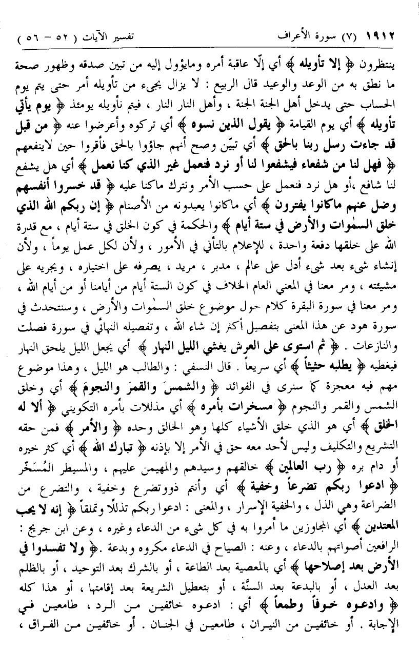 إِنَّ رَبَّكُمُ اللَّهُ الَّذِي خَلَقَ السَّماواتِ وَالْأَرْضَ فِي سِتَّةِ أَيَّامٍ والحكمة في كون الخلق في ستة أيام، مع قدرة الله على خلقها دفعة واحدة، للإعلام بالتأني في الأمور، ولأن لكل عمل يوما، ولأن إنشاء شئ بعد شئ أدل على عالم، مدبر، مريد، يصرفه على اختياره، ويجريه على مشيئته، ومر معنا في المعني العام الخلاف في كون الستة أيام من أيامنا أو من أيام الله، ومر معنا في سورة البقرة كلام حول موضوع خلق السموات والأرض، وسنتحدث في سورة هود عن هذا المعنى بتفصيل أكثر إن شاء الله، وتفصيله النهائي في سورة فصلت والنازعات. ثُمَّ اسْتَوى عَلَى الْعَرْشِ يُغْشِي اللَّيْلَ النَّهارَ أي يجعل الليل يلحق النهار فيغطيه يَطْلُبُهُ حَثِيثاً أي سريعا. قال النسفي: والطالب هو الليل، وهذا موضوع مهم فيه معجزة كما سنرى في الفوائد وَالشَّمْسَ وَالْقَمَرَ وَالنُّجُومَ أي وخلق الشمس والقمر والنجوم مُسَخَّراتٍ بِأَمْرِهِ أي مذللات بأمره التكويني أَلا لَهُ الْخَلْقُ أي هو الذي خلق الأشياء كلها وهو الخالق وحده وَالْأَمْرُ فمن حقه التشريع والتكليف وليس لأحد معه حق في الأمر إلا بإذنه تَبارَكَ اللَّهُ أي كثر خيره أو دام بره رَبُّ الْعالَمِينَ خالقهم وسيدهم والمهيمن عليهم، والمسيطر المسخر