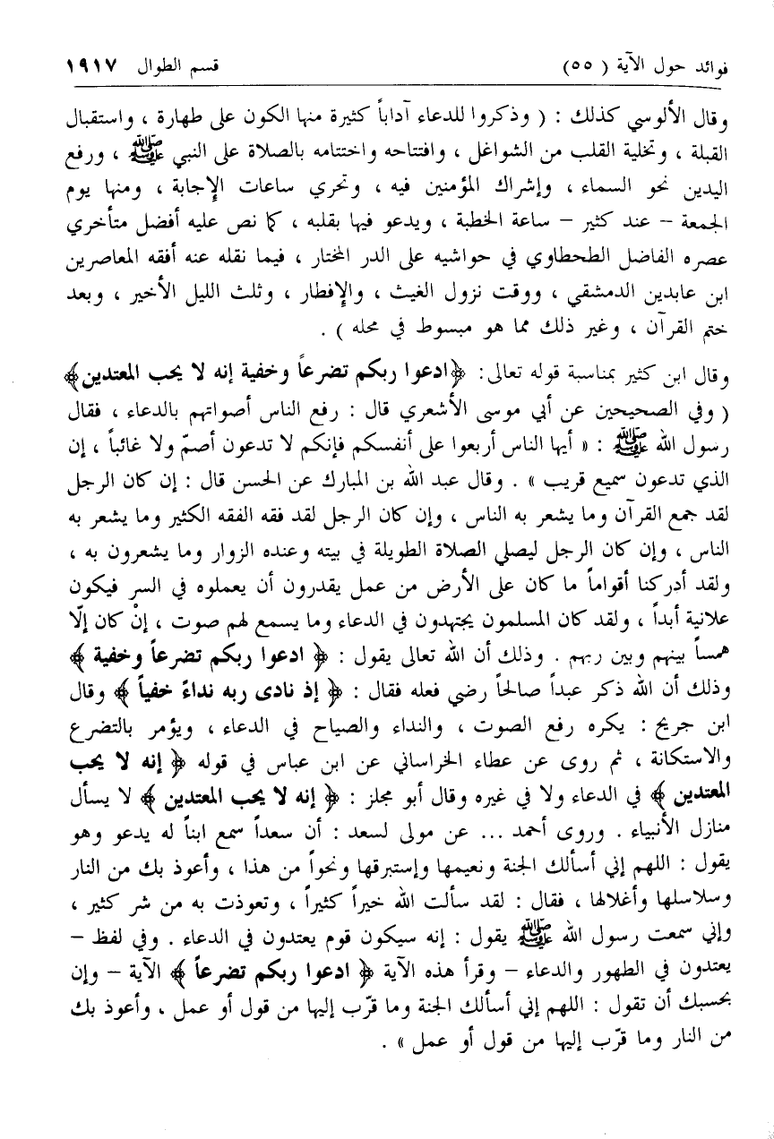 وقال ابن كثير بمناسبة قوله تعالى: ادْعُوا رَبَّكُمْ تَضَرُّعاً وَخُفْيَةً إِنَّهُ لا يُحِبُّ الْمُعْتَدِينَ (وفي الصحيحين عن أبي موسى الأشعري قال: رفع الناس أصواتهم بالدعاء، فقال رسول الله صلى الله عليه وسلم: «أيها الناس أربعوا على أنفسكم فإنكم لا تدعون أصم ولا غائبا، إن الذي تدعون سميع قريب». وقال عبد الله بن المبارك عن الحسن قال: إن كان الرجل لقد جمع القرآن وما يشعر به الناس، وإن كان الرجل لقد فقه الفقه الكثير وما يشعر به الناس، وإن كان الرجل ليصلي الصلاة الطويلة في بيته وعنده الزوار وما يشعرون به، ولقد أدركنا أقواما ما كان على الأرض من عمل يقدرون أن يعملوه في السر فيكون علانية أبدا، ولقد كان المسلمون يجتهدون في الدعاء وما يسمع لهم صوت، إن كان إلا همسا بينهم وبين ربهم. وذلك أن الله تعالى يقول: ادْعُوا رَبَّكُمْ تَضَرُّعاً وَخُفْيَةً وذلك أن الله ذكر عبدا صالحا رضي فعله فقال: إِذْ نادى رَبَّهُ نِداءً خَفِيًّا وقال ابن جريح: يكره رفع الصوت، والنداء والصياح في الدعاء، ويؤمر بالتضرع والاستكانة، ثم روى عن عطاء الخراساني عن ابن عباس في قوله إِنَّهُ لا يُحِبُّ الْمُعْتَدِينَ في الدعاء ولا في غيره وقال أبو مجلز: إِنَّهُ لا يُحِبُّ الْمُعْتَدِينَ لا يسأل منازل الأنبياء. وروى أحمد ... عن مولى لسعد: أن سعدا سمع ابنا له يدعو وهو يقول: اللهم إني أسألك الجنة ونعيمها وإستبرقها ونحوا من هذا، وأعوذ بك من النار وسلاسلها وأغلالها، فقال: لقد سألت الله خيرا كثيرا، وتعوذت به من شر كثير، وإني سمعت رسول الله صلى الله عليه وسلم يقول: إنه سيكون قوم يعتدون في الدعاء. وفي لفظ- يعتدون في الطهور والدعاء- وقرأ هذه الآية ادْعُوا رَبَّكُمْ تَضَرُّعاً الآية- وإن بحسبك أن تقول: اللهم إني أسألك الجنة وما قرب إليها من قول أو عمل، وأعوذ بك من النار وما قرب إليها من قول أو عمل».