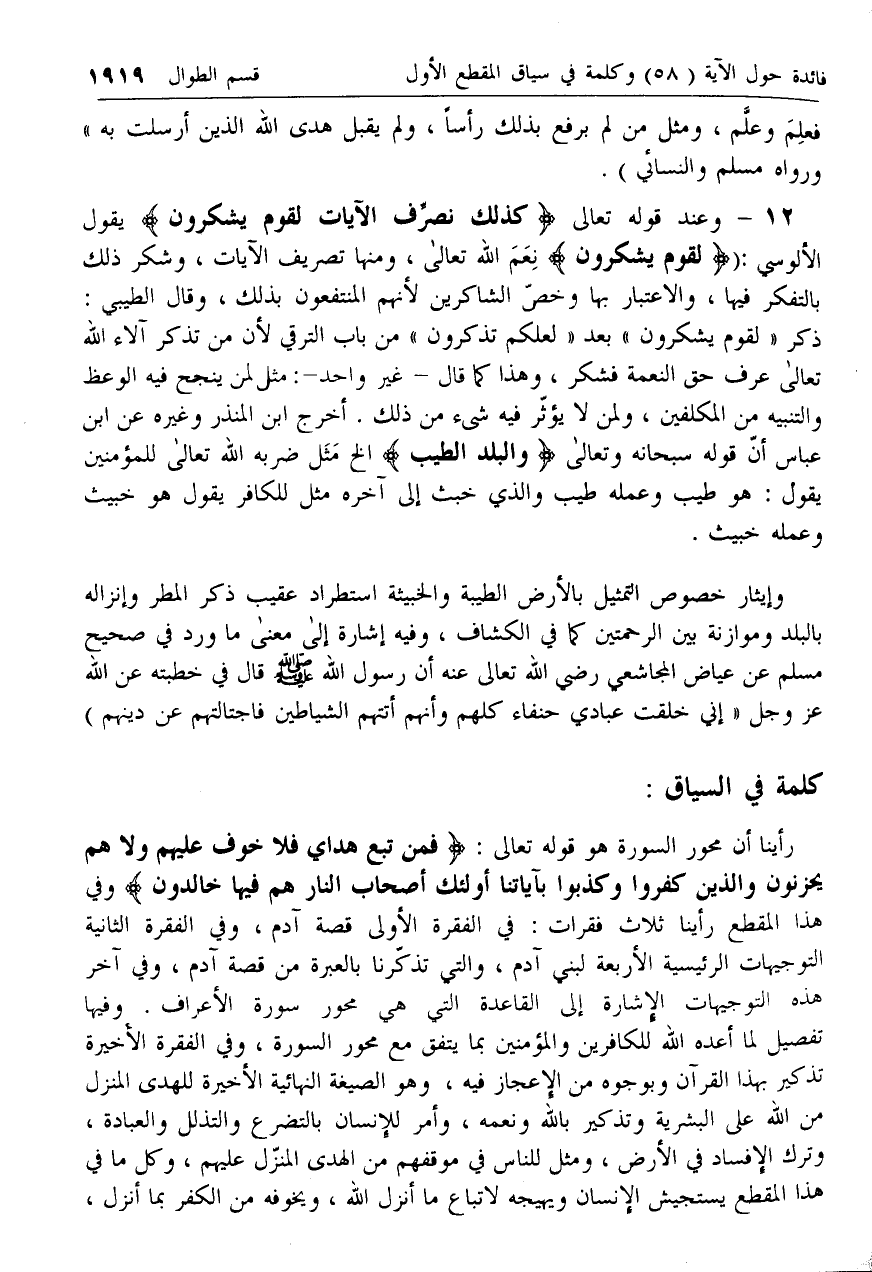 12 - وعند قوله تعالى كَذلِكَ نُصَرِّفُ الْآياتِ لِقَوْمٍ يَشْكُرُونَ يقول الألوسي: (لِقَوْمٍ يَشْكُرُونَ نعم الله تعالى، ومنها تصريف الآيات، وشكر ذلك بالتفكر فيها، والاعتبار بها وخص الشاكرين لأنهم المنتفعون بذلك، وقال الطيبي: