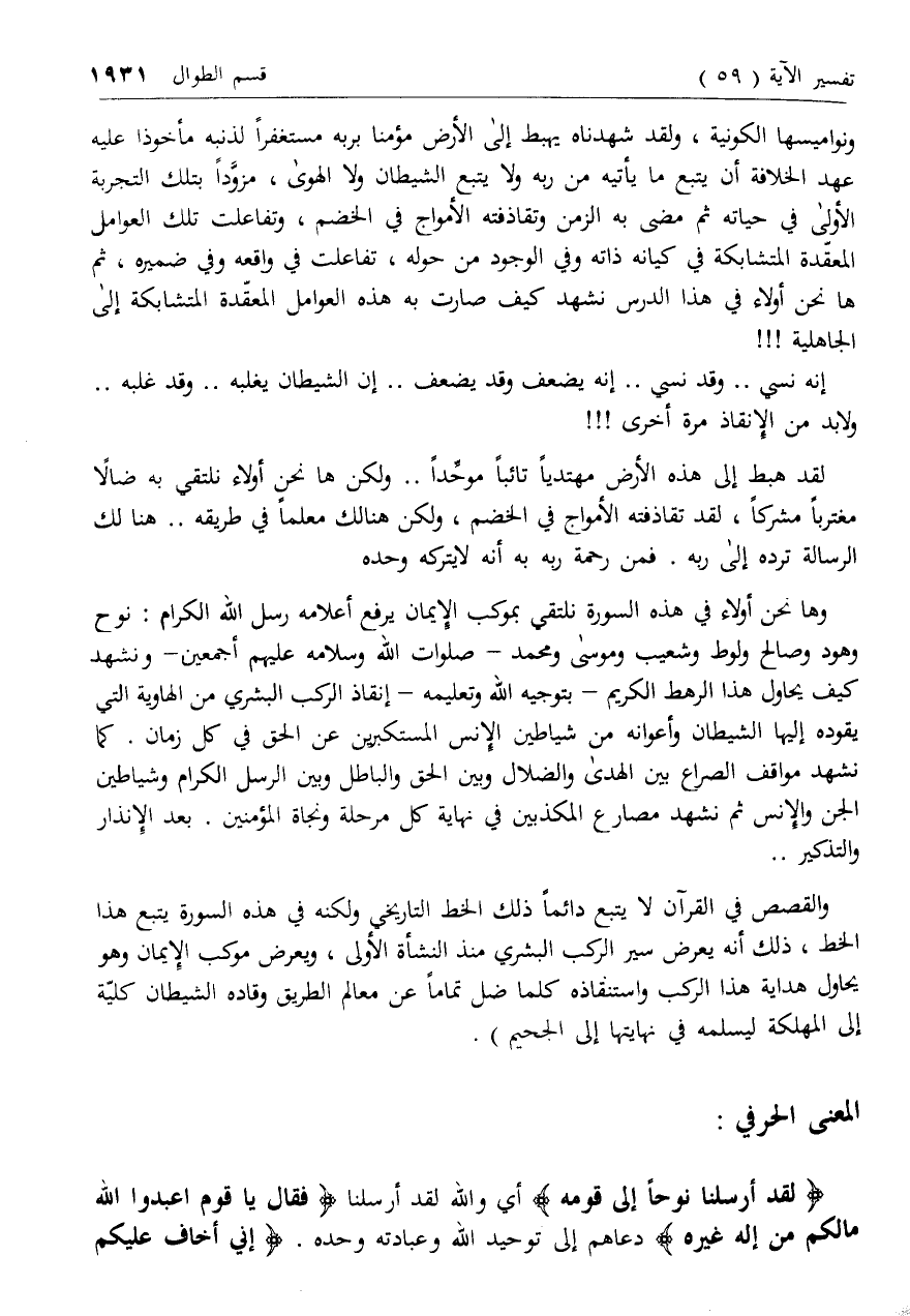 والقصص في القرآن لا يتبع دائما ذلك الخط التاريخي ولكنه في هذه السورة يتبع هذا الخط، ذلك أنه يعرض سير الركب البشري منذ النشأة الأولى، ويعرض موكب الإيمان وهو يحاول هداية هذا الركب واستنقاذه كلما ضل تماما عن معالم الطريق وقاده الشيطان كلية إلى المهلكة ليسلمه في نهايتها إلى الجحيم).