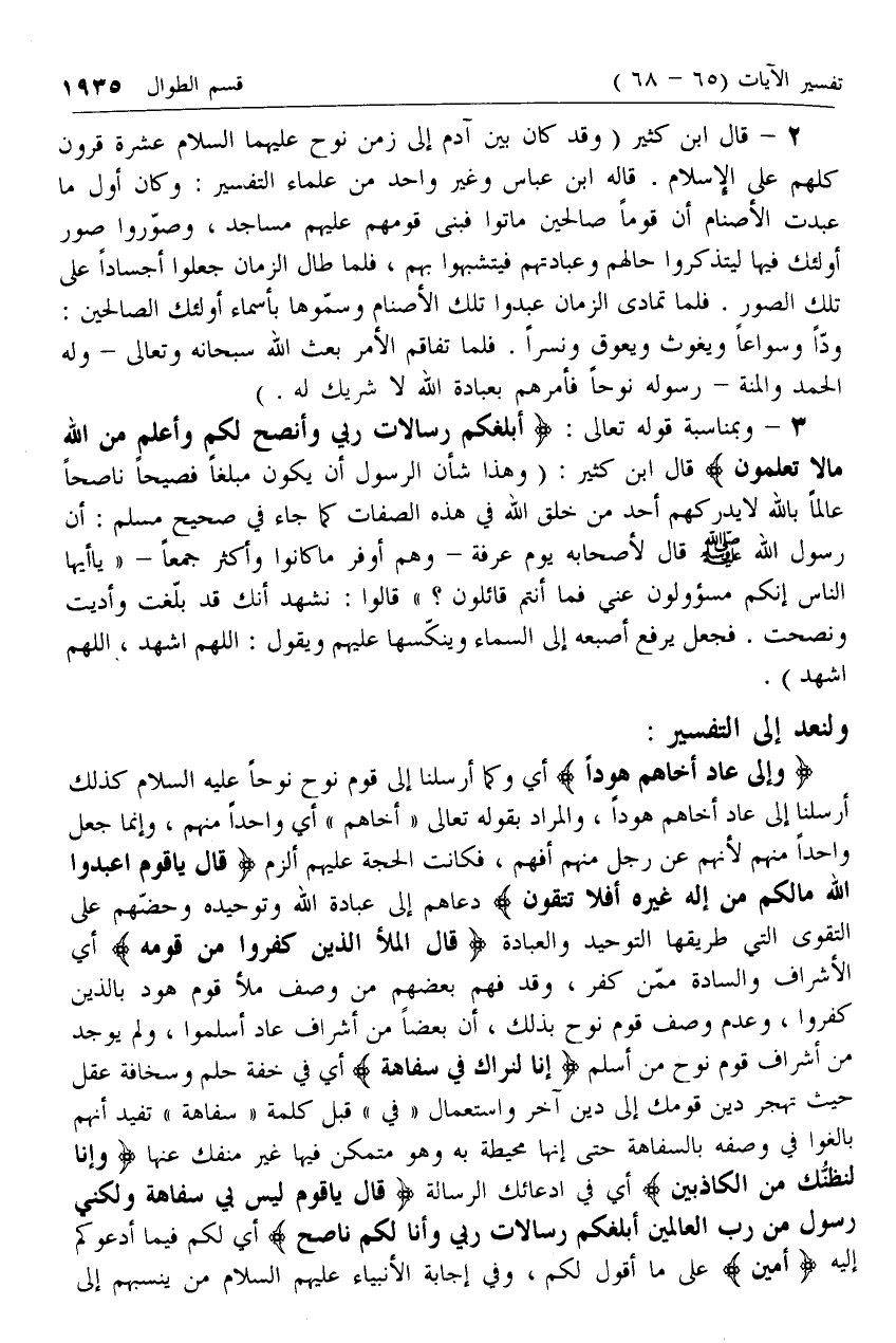 2 - قال ابن كثير (وقد كان بين آدم إلى زمن نوح عليهما السلام عشرة قرون كلهم على الإسلام. قاله ابن عباس وغير واحد من علماء التفسير: وكان أول ما عبدت الأصنام أن قوما صالحين ماتوا فبنى قومهم عليهم مساجد، وصوروا صور أولئك فيها ليتذكروا حالهم وعبادتهم فيتشبهوا بهم، فلما طال الزمان جعلوا أجسادا على تلك الصور. فلما تمادى الزمان عبدوا تلك الأصنام وسموها بأسماء أولئك الصالحين: