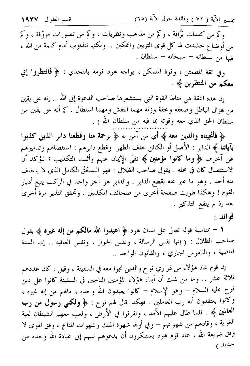 1 - بمناسبة قوله تعالى على لسان هود اعْبُدُوا اللَّهَ ما لَكُمْ مِنْ إِلهٍ غَيْرُهُ يقول صاحب الظلال: (إنها نفس الرسالة، ونفس الحوار، ونفس العاقبة .. إنها السنة الماضية، والناموس الجاري، والقانون الواحد ..