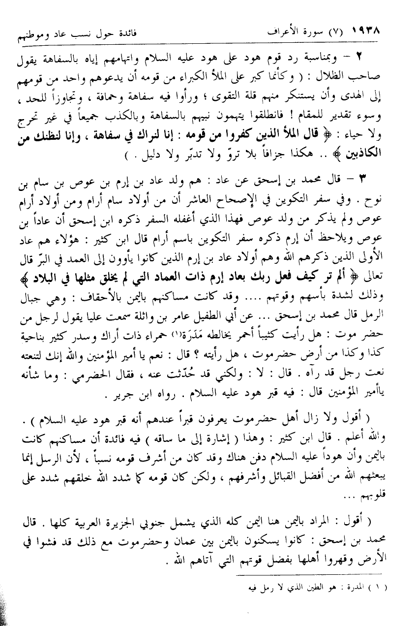 3 - قال محمد بن إسحاق عن عاد: هم ولد عاد بن إرم بن عوص بن سام بن نوح. وفي سفر التكوين في الإصحاح العاشر أن من أولاد سام أرام ومن أولاد أرام عوص ولم يذكر من ولد عوص فهذا الذي أغفله السفر ذكره ابن إسحاق أن عادا بن عوص ويلاحظ أن إرم ذكره سفر التكوين باسم أرام قال ابن كثير: هؤلاء هم عاد الأولى الذين ذكرهم الله وهم أولاد عاد بن إرم الذين كانوا يأوون إلى العمد في البر قال تعالى أَلَمْ تَرَ كَيْفَ فَعَلَ رَبُّكَ بِعادٍ إِرَمَ ذاتِ الْعِمادِ الَّتِي لَمْ يُخْلَقْ مِثْلُها فِي الْبِلادِ وذلك لشدة بأسهم وقوتهم .... وقد كانت مساكنهم باليمن بالأحقاف: وهي جبال الرمل قال محمد بن إسحاق ... عن أبي الطفيل عامر بن واثلة سمعت عليا يقول لرجل من حضرموت: هل رأيت كثيبا أحمر يخالطه مدرة (¬1) حمراء ذات أراك وسدر كثير بناحية كذا وكذا من أرض حضرموت، هل رأيته؟ قال: نعم يا أمير المؤمنين والله إنك لتنعته نعت رجل قد رآه. قال: لا: ولكني قد حدثت عنه، فقال الحضرمي: وما شأنه يا أمير المؤمنين قال: فيه قبر هود عليه السلام. رواه ابن جرير.