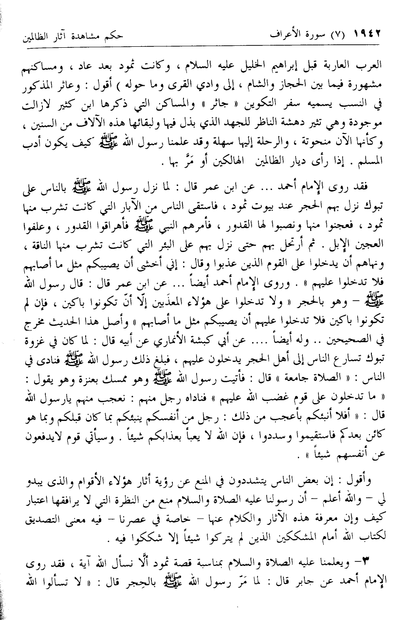 وأقول: إن بعض الناس يتشددون في المنع عن رؤية أثار هؤلاء الأقوام والذى يبدو لي- والله أعلم- أن رسولنا عليه الصلاة والسلام منع من النظرة التي لا يرافقها اعتبار كيف وإن معرفة هذه الآثار والكلام عنها- خاصة في عصرنا- فيه معنى التصديق لكتاب الله أمام المشككين الذين لم يتركوا شيئا إلا شككوا فيه.