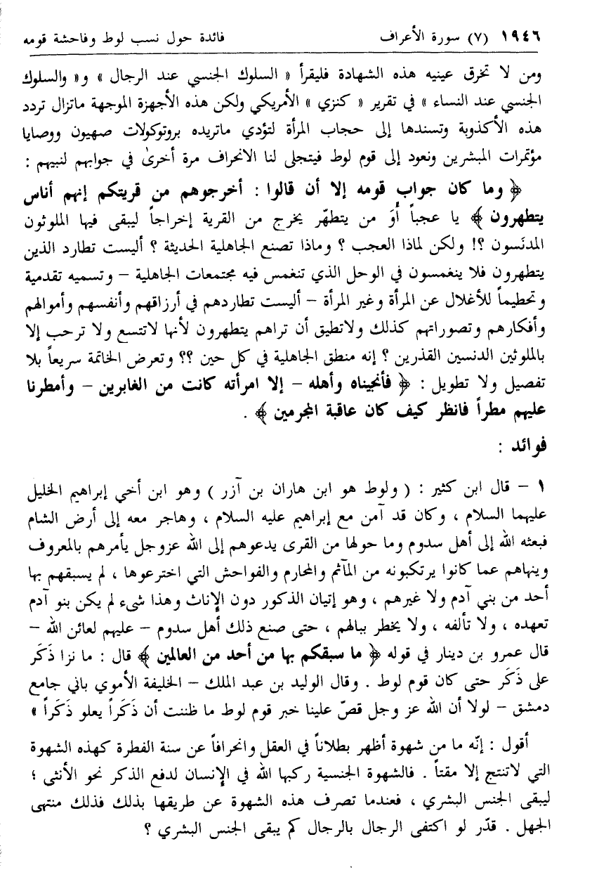 ومن لا تخرق عينيه هذه الشهادة فليقرأ «السلوك الجنسي عند الرجال» و «والسلوك الجنسي عند النساء» في تقرير «كنزي» الأمريكي ولكن هذه الأجهزة الموجهة ما تزال تردد هذه الأكذوبة وتسندها إلى حجاب المرأة لتؤدي ما تريده بروتوكولات صهيون ووصايا مؤتمرات المبشرين ونعود إلى قوم لوط فيتجلى لنا الانحراف مرة أخرى في جوابهم لنبيهم: