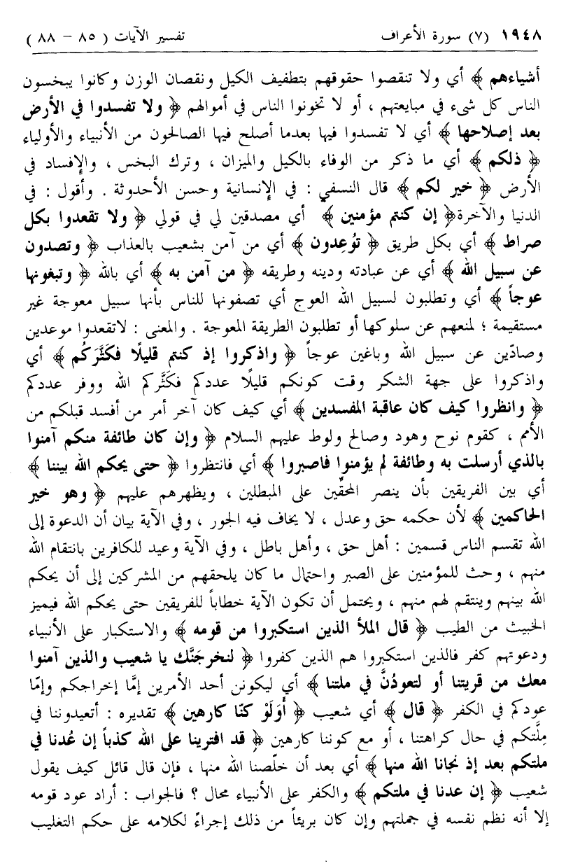 وَلا تَقْعُدُوا بِكُلِّ صِراطٍ أي بكل طريق تُوعِدُونَ أي من آمن بشعيب بالعذاب وَتَصُدُّونَ عَنْ سَبِيلِ اللَّهِ أي عن عبادته ودينه وطريقه مَنْ آمَنَ بِهِ أي بالله وَتَبْغُونَها عِوَجاً أي وتطلبون لسبيل الله العوج أي تصفونها للناس بأنها سبيل معوجة غير مستقيمة؛ لمنعهم عن سلوكها أو تطلبون الطريقة المعوجة. والمعنى: لا تقعدوا موعدين وصادين عن سبيل الله وباغين عوجا وَاذْكُرُوا إِذْ كُنْتُمْ قَلِيلًا فَكَثَّرَكُمْ أي واذكروا على جهة الشكر وقت كونكم قليلا عددكم فكثركم الله ووفر عددكم وَانْظُرُوا كَيْفَ كانَ عاقِبَةُ الْمُفْسِدِينَ أي كيف كان آخر أمر من أفسد قبلكم من الأمم، كقوم نوح وهود وصالح ولوط عليهم السلام