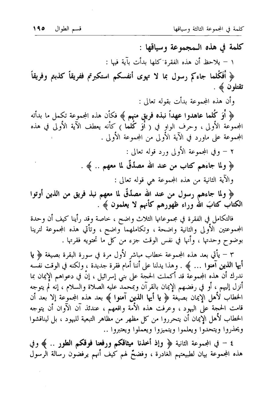 4 - في المجموعة الثانية وَإِذْ أَخَذْنا مِيثاقَكُمْ وَرَفَعْنا فَوْقَكُمُ الطُّورَ .. وفي هذه المجموعة بيان لطبيعتهم الغادرة، وفضح لهم كيف أنهم يرفضون رسالة الرسول