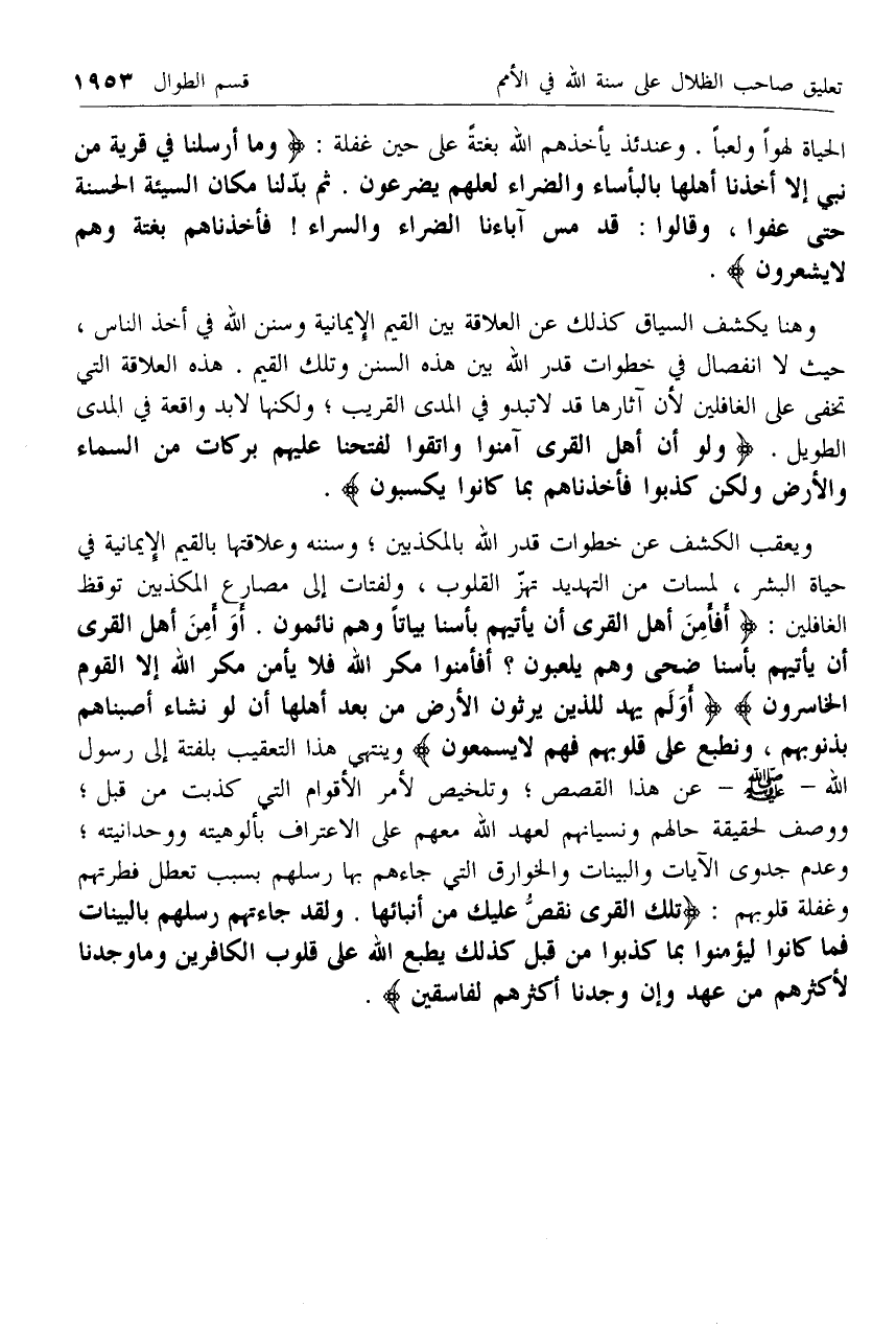 وهنا يكشف السياق كذلك عن العلاقة بين القيم الإيمانية وسنن الله في أخذ الناس، حيث لا انفصال في خطوات قدر الله بين هذه السنن وتلك القيم. هذه العلاقة التي تخفى على الغافلين لأن آثارها قد لا تبدو في المدى القريب؛ ولكنها لا بد واقعة في المدى الطويل. وَلَوْ أَنَّ أَهْلَ الْقُرى آمَنُوا وَاتَّقَوْا لَفَتَحْنا عَلَيْهِمْ بَرَكاتٍ مِنَ السَّماءِ وَالْأَرْضِ وَلكِنْ كَذَّبُوا فَأَخَذْناهُمْ بِما كانُوا يَكْسِبُونَ.