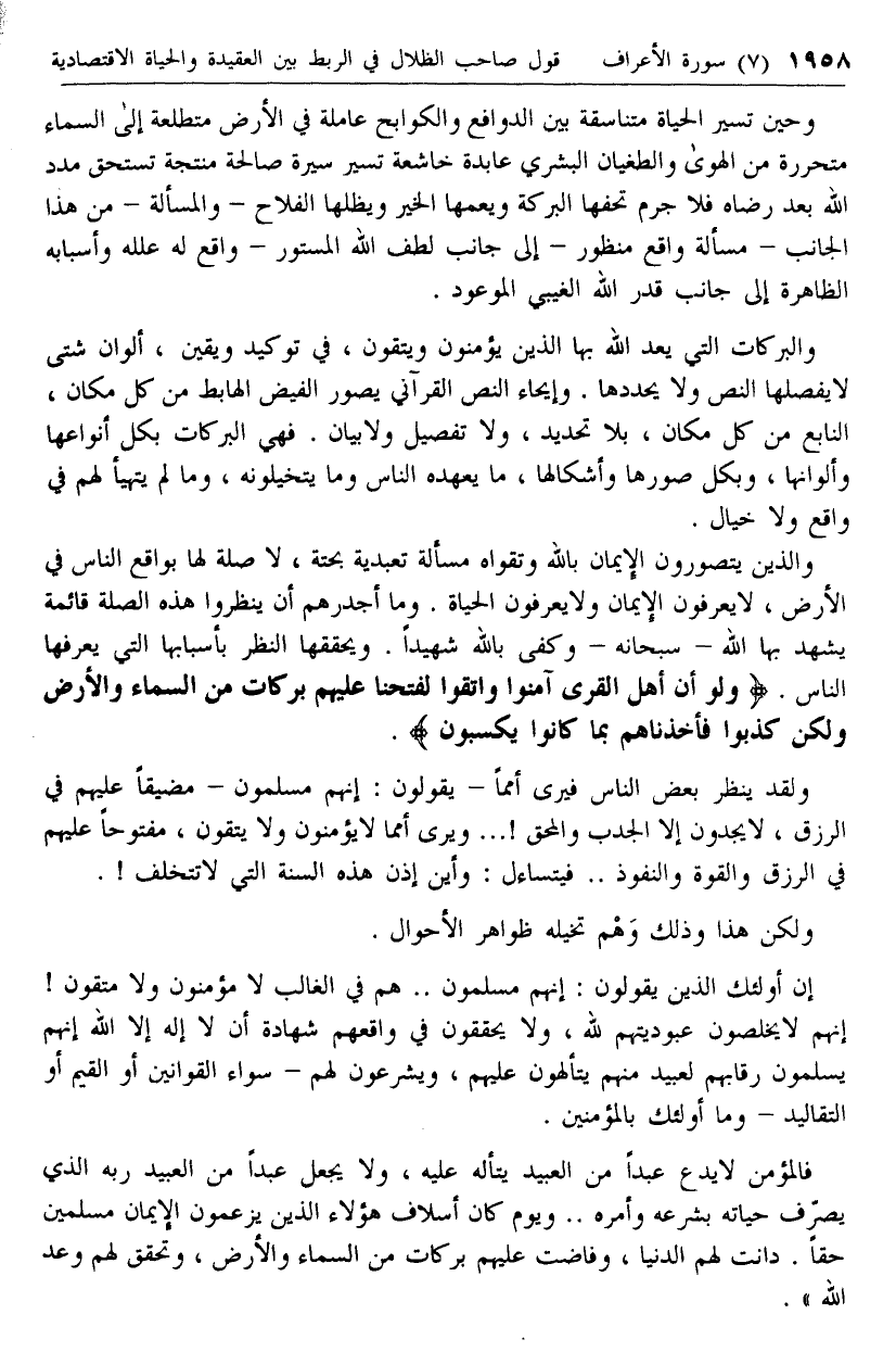 والذين يتصورون الإيمان بالله وتقواه مسألة تعبدية بحتة، لا صلة لها بواقع الناس في الأرض، لا يعرفون الإيمان ولا يعرفون الحياة. وما أجدرهم أن ينظروا هذه الصلة قائمة يشهد بها الله- سبحانه- وكفى بالله شهيدا. ويحققها النظر بأسبابها التي يعرفها الناس. وَلَوْ أَنَّ أَهْلَ الْقُرى آمَنُوا وَاتَّقَوْا لَفَتَحْنا عَلَيْهِمْ بَرَكاتٍ مِنَ السَّماءِ وَالْأَرْضِ وَلكِنْ كَذَّبُوا فَأَخَذْناهُمْ بِما كانُوا يَكْسِبُونَ.