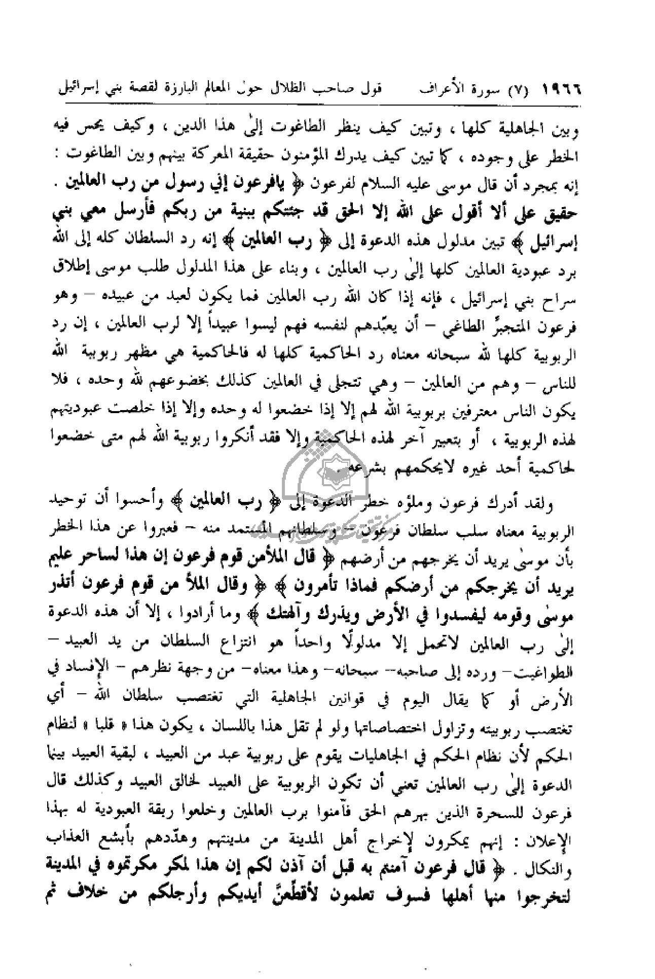 إنه بمجرد أن قال موسى عليه السلام لفرعون يا فِرْعَوْنُ إِنِّي رَسُولٌ مِنْ رَبِّ الْعالَمِينَ. حَقِيقٌ عَلى أَنْ لا أَقُولَ عَلَى اللَّهِ إِلَّا الْحَقَّ قَدْ جِئْتُكُمْ بِبَيِّنَةٍ مِنْ رَبِّكُمْ فَأَرْسِلْ مَعِيَ بَنِي إِسْرائِيلَ تبين مدلول هذه الدعوة إلى رَبِّ الْعالَمِينَ إنه رد السلطان كله إلى الله برد عبودية العالمين كلها إلى رب العالمين، وبناء على هذا المدلول طلب موسى إطلاق سراح بني إسرائيل، فإنه إذا كان الله رب العالمين فما يكون لعبد من عبيده- وهو فرعون المتجبر الطاغي- أن يعبدهم لنفسه فهم ليسوا عبيدا إلا لرب العالمين، إن رد الربوبية كلها لله سبحانه معناه رد الحاكمية كلها له فالحاكمية هي مظهر ربوبية الله للناس- وهم من العالمين- وهي تتجلى في العالمين كذلك بخضوعهم لله وحده، فلا يكون الناس معترفين بربوبية الله لهم إلا إذا خضعوا له وحده وإلا إذا خلصت عبوديتهم لهذه الربوبية، أو بتعبير آخر لهذه الحاكمية وإلا فقد أنكروا ربوبية الله لهم متى خضعوا لحاكمية أحد غيره لا يحكمهم بشرعه.