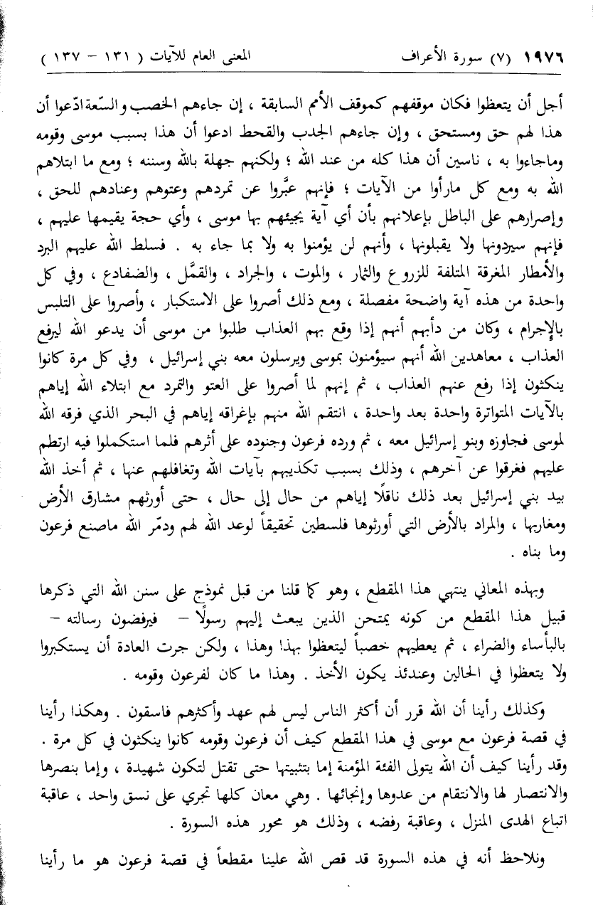 وبهذه المعاني ينتهي هذا المقطع، وهو كما قلنا من قبل نموذج على سنن الله التي ذكرها قبيل هذا المقطع من كونه يمتحن الذين يبعث إليهم رسولا- فيرفضون رسالته- بالبأساء والضراء، ثم يعطيهم خصبا ليتعظوا بهذا وهذا، ولكن جرت العادة أن يستكبروا ولا يتعظوا في الحالين وعندئذ يكون الأخذ. وهذا ما كان لفرعون وقومه.