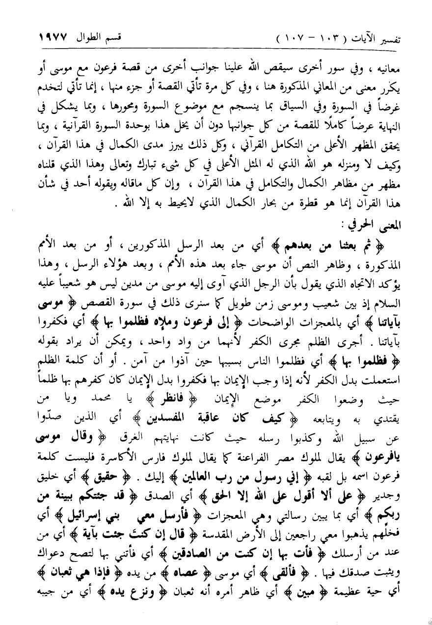 معانيه، وفي سور أخرى سيقص الله علينا جوانب أخرى من قصة فرعون مع موسى أو يكرر معنى من المعاني المذكورة هنا، وفي كل مرة تأتي القصة أو جزء منها، إنما تأتي لتخدم غرضا في السورة وفي السياق بما ينسجم مع موضوع السورة ومحورها، وبما يشكل في النهاية عرضا كاملا للقصة من كل جوانبها دون أن يخل هذا بوحدة السورة القرآنية، وبما يحقق المظهر الأعلى من التكامل القرآني، وكل ذلك يبرز مدى الكمال في هذا القرآن، وكيف لا ومنزله هو الله الذي له المثل الأعلى في كل شئ تبارك وتعالى وهذا الذي قلناه مظهر من مظاهر الكمال والتكامل في هذا القرآن، وإن كل ما قاله ويقوله أحد في شأن هذا القرآن إنما هو قطرة من بحار الكمال الذي لا يحيط به إلا الله.