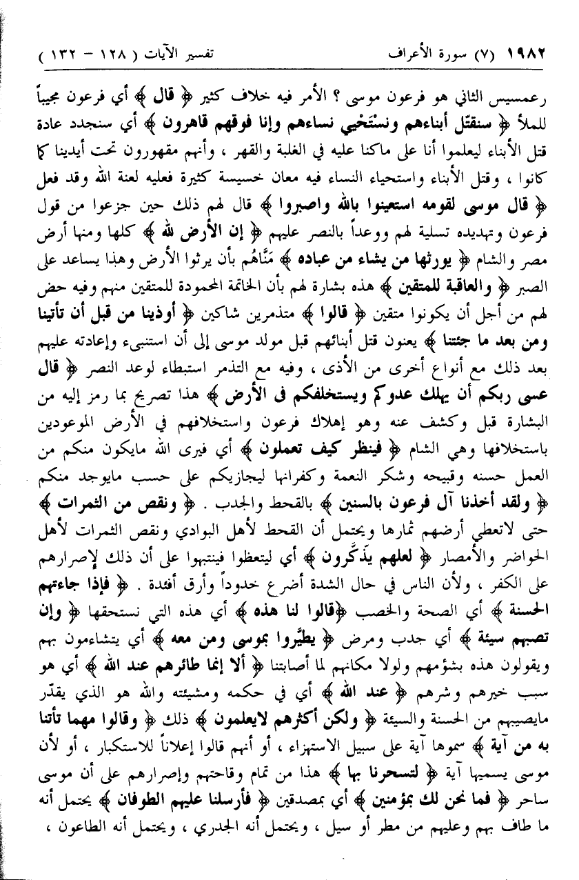 وَلَقَدْ أَخَذْنا آلَ فِرْعَوْنَ بِالسِّنِينَ بالقحط والجدب. وَنَقْصٍ مِنَ الثَّمَراتِ حتى لا تعطي أرضهم ثمارها ويحتمل أن القحط لأهل البوادي ونقص الثمرات لأهل الحواضر والأمصار لَعَلَّهُمْ يَذَّكَّرُونَ أي ليتعظوا فينتبهوا على أن ذلك لإصرارهم على الكفر، ولأن الناس في حال الشدة أضرع خدودا وأرق أفئدة.
