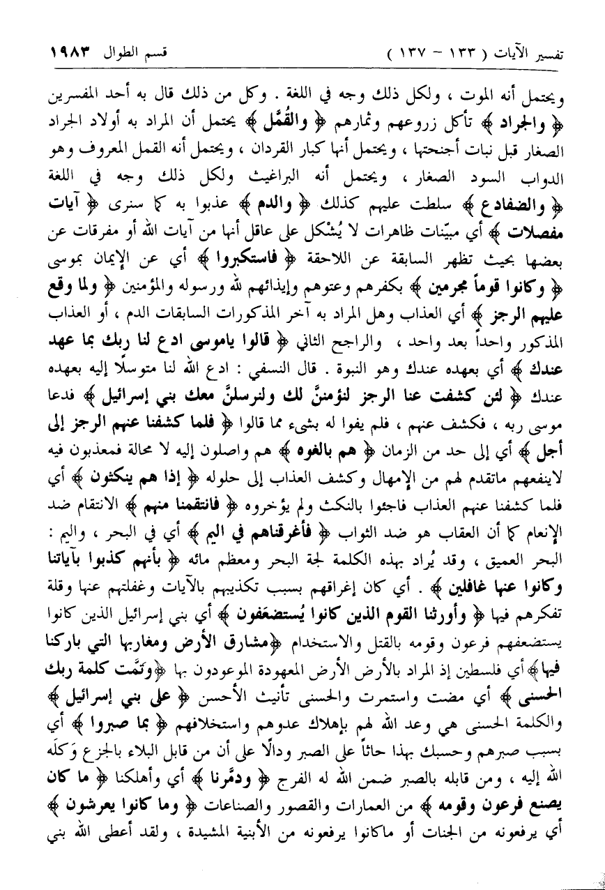ويحتمل أنه الموت، ولكل ذلك وجه في اللغة. وكل من ذلك قال به أحد المفسرين وَالْجَرادَ تأكل زروعهم وثمارهم وَالْقُمَّلَ يحتمل أن المراد به أولاد الجراد الصغار قبل نبات أجنحتها، ويحتمل أنها كبار القردان، ويحتمل أنه القمل المعروف وهو الدواب السود الصغار، ويحتمل أنه البراغيث ولكل ذلك وجه في اللغة وَالضَّفادِعَ سلطت عليهم كذلك وَالدَّمَ عذبوا به كما سنرى آياتٍ مُفَصَّلاتٍ أي مبينات ظاهرات لا يشكل على عاقل أنها من آيات الله أو مفرقات عن بعضها بحيث تظهر السابقة عن اللاحقة فَاسْتَكْبَرُوا أي عن الإيمان بموسى وَكانُوا قَوْماً مُجْرِمِينَ بكفرهم وعتوهم وإيذائهم لله ورسوله والمؤمنين