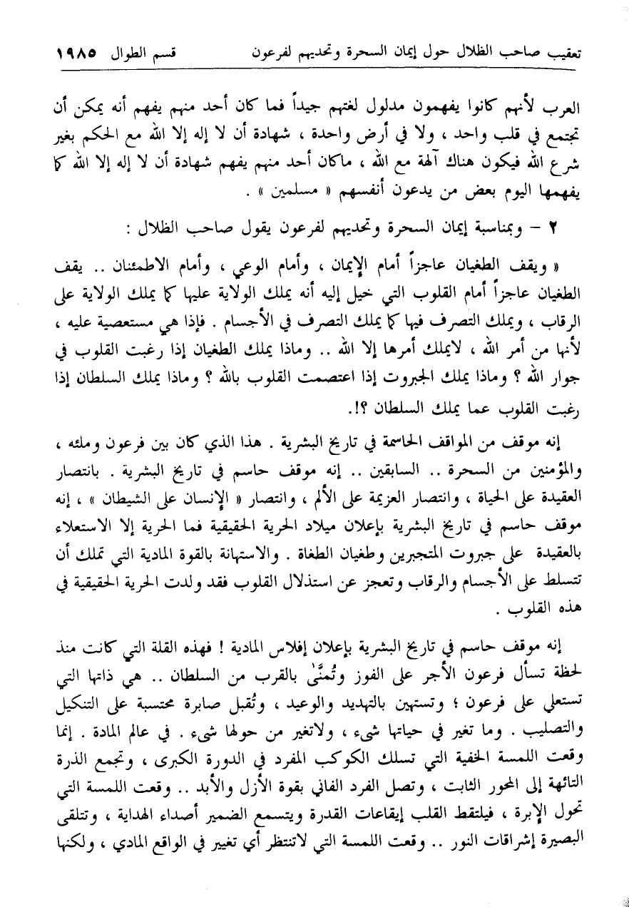 «ويقف الطغيان عاجزا أمام الإيمان، وأمام الوعي، وأمام الاطمئنان .. يقف الطغيان عاجزا أمام القلوب التي خيل إليه أنه يملك الولاية عليها كما يملك الولاية على الرقاب، ويملك التصرف فيها كما يملك التصرف في الأجسام. فإذا هي مستعصية عليه، لأنها من أمر الله، لا يملك أمرها إلا الله .. وماذا يملك الطغيان إذا رغبت القلوب في جوار الله؟ وماذا يملك الجبروت إذا اعتصمت القلوب بالله؟ وماذا يملك السلطان إذا رغبت القلوب عما يملك السلطان؟!.