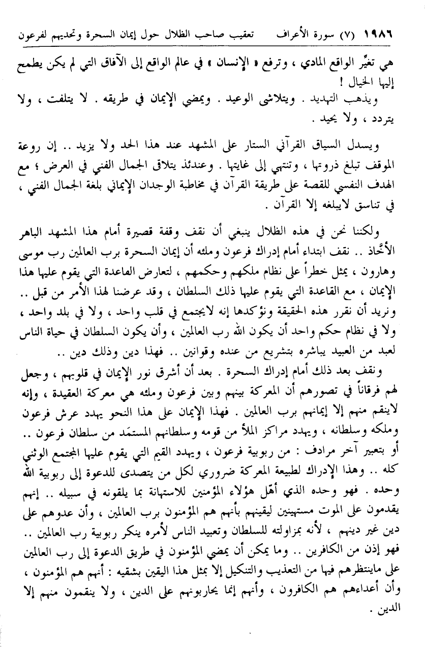 ولكننا نحن في هذه الظلال ينبغي أن نقف وقفة قصيرة أمام هذا المشهد الباهر الأخاذ .. نقف ابتداء أمام إدراك فرعون وملئه أن إيمان السحرة برب العالمين رب موسى وهارون، يمثل خطرا على نظام ملكهم وحكمهم، لتعارض القاعدة التي يقوم عليها هذا الإيمان، مع القاعدة التي يقوم عليها ذلك السلطان، وقد عرضنا لهذا الأمر من قبل ..