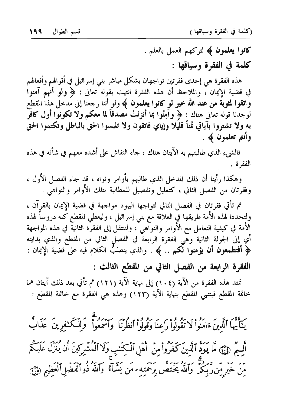 ثم تأتي فقرتان في الفصل الثاني لتواجها اليهود مواجهة في قضية الإيمان بالقرآن، ولتحددا لهذه الأمة طريقها في العلاقة مع بني إسرائيل، وليعطي المقطع كله دروسا لهذه الأمة في كيفية التعامل مع الأوامر والنواهي، ولننتقل إلى الفقرة الثانية في هذه المواجهة أي إلى الجولة الثانية وهي الفقرة الرابعة في الفصل الثاني من المقطع والذي بدايته أَفَتَطْمَعُونَ أَنْ يُؤْمِنُوا لَكُمْ ... والذي ينصب الكلام فيه على قضية الإيمان: