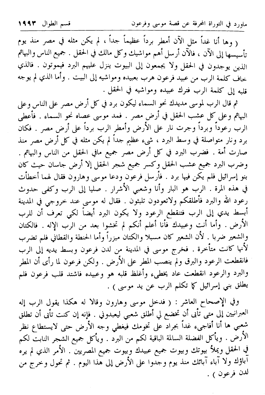 وضرب البرد جميع عشب الحقل وكسر جميع شجر الحقل إلا أرض جاسان حيث كان بنو إسرائيل فلم يكن فيها برد. فأرسل فرعون ودعا موسى وهارون فقال لهما أخطأت في هذه المرة. الرب هو البار وأنا وشعبي الأشرار. صليا إلى الرب وكفى حدوث رعود الله والبرد فأطلقكم ولا تعودون تلبثون. فقال له موسى عند خروجي في المدينة أبسط يدي إلى الرب فتنقطع الرعود ولا يكون البرد أيضا لكي تعرف أن للرب الأرض. وأما أنت وعبيدك فأنا أعلم أنكم لم تخشوا بعد من الرب الإله. فالكتان والشعير ضربا. لأن الشعير كان مسبلا والكتان مبزرا وأما الحنطة والقطاني فلم تضرب لأنها كانت متأخرة. فخرج موسى في المدينة من لدن فرعون وبسط يديه إلى الرب فانقطعت الرعود والبرق ولم ينصب المطر على الأرض. ولكن فرعون لما رأى أن المطر والبرد والرعود انقطعت عاد يخطئ وأغلظ قلبه هو وعبيده فاشتد قلب فرعون فلم يطلق بني إسرائيل كما تكلم الرب عن يد موسى).