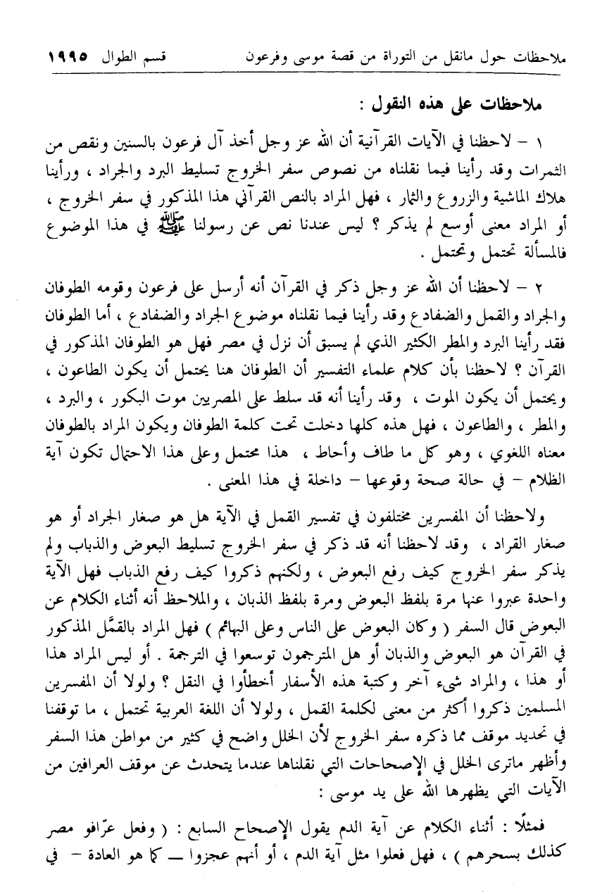 ولاحظنا أن المفسرين مختلفون في تفسير القمل في الآية هل هو صغار الجراد أو هو صغار القراد، وقد لاحظنا أنه قد ذكر في سفر الخروج تسليط البعوض والذباب ولم يذكر سفر الخروج كيف رفع البعوض، ولكنهم ذكروا كيف رفع الذباب فهل الآية واحدة عبروا عنها مرة بلفظ البعوض ومرة بلفظ الذبان، والملاحظ أنه أثناء الكلام عن البعوض قال السفر (وكان البعوض على الناس وعلى البهائم) فهل المراد بالقمل المذكور في القرآن هو البعوض والذبان أو هل المترجمون توسعوا في الترجمة. أو ليس المراد هذا أو هذا، والمراد شئ آخر وكتبة هذه الأسفار أخطئوا في النقل؟ ولولا أن المفسرين المسلمين ذكروا أكثر من معنى لكلمة القمل، ولولا أن اللغة العربية تحتمل، ما توقفنا في تحديد موقف مما ذكره سفر الخروج لأن الخلل واضح في كثير من مواطن هذا السفر وأظهر ما ترى الخلل في الإصحاحات التي نقلناها عند ما يتحدث عن موقف العرافين من الآيات التي يظهرها الله على يد موسى: