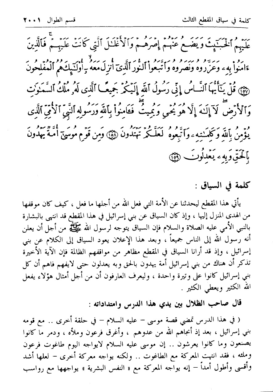يأتي هذا المقطع ليحدثنا عن الأمة التي فعل الله من أجلها ما فعل، كيف كان موقفها من الهدى المنزل إليها، وإذ كان السياق عن بني إسرائيل في هذا المقطع قد انتهى بالبشارة بالنبي الأمي عليه الصلاة والسلام فإن السياق يتوجه لرسول الله صلى الله عليه وسلم من أجل أن يعلن أنه رسول الله إلى الناس جميعا، وبعد هذا الإعلان يعود السياق إلى الكلام عن بني إسرائيل، وإذ قد أرانا السياق في المقطع مظاهر من مواقفهم الظالمة فإن الآية الأخيرة تذكر أن هناك من بني إسرائيل أمة يهدون بالحق وبه يعدلون حتى لا يفهم فاهم أن كل بني إسرائيل كانوا على وتيرة واحدة، وليعرف العارفون أن من أجل أمثال هؤلاء يفعل الله الكثير ويعطي الكثير.