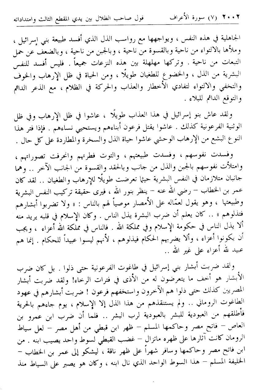 ولقد ضربت أبشار بني إسرائيل في طاغوت الفرعونية حتى ذلوا. بل كان ضرب الأبشار هو أخف ما يتعرضون له من الأذى في فترات الرخاء! ولقد ضربت أبشار المصريين كذلك حتى ذلوا هم الآخرون واستخفهم فرعون! ضربت أبشارهم في عهود الطاغوت الروماني .. ولم يستنقذهم من هذا الذل إلا الإسلام، يوم جاءهم بالحرية فأطلقهم من العبودية للبشر بالعبودية لرب البشر .. فلما أن ضرب ابن عمرو بن العاص- فاتح مصر وحاكمها المسلم- ظهر ابن قبطي من أهل مصر- لعل سياط الرومان كانت آثارها على ظهره ما تزال- غضب القبطي لسوط واحد يصيب ابنه. من ابن فاتح مصر وحاكمها وسافر شهرا على ظهر ناقة، ليشكو إلى عمر بن الخطاب- الخليفة المسلم- هذا السوط الواحد الذي نال ابنه، وكان هو يصبر على السياط منذ