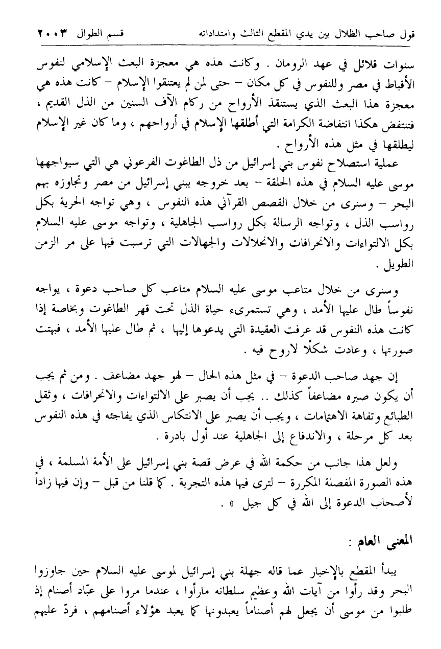 وسنرى من خلال متاعب موسى عليه السلام متاعب كل صاحب دعوة، يواجه نفوسا طال عليها الأمد، وهي تستمرئ حياة الذل تحت قهر الطاغوت وبخاصة إذا كانت