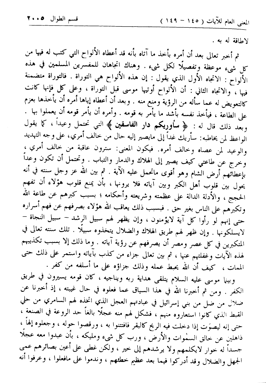 ثم أخبر تعالى بعد أن أمره بأخذ ما آتاه بأنه قد أعطاه الألواح التي كتب له فيها من كل شئ موعظة وتفصيلا لكل شئ. وهناك اتجاهان للمفسرين المسلمين في هذه الألواح: الاتجاه الأول الذي يقول: إن هذه الألواح هي التوراة. فالتوراة متضمنة فيها، والاتجاه الثاني: أن الألواح أوتيها موسى قبل التوراة، وعلى كل فإنها كانت كالتعويض له عما سأله من الرؤية ومنع منه. وبعد أن أعطاه إياها أمره أن يأخذها بعزم على الطاعة، فيأخذ نفسه بأشد ما يأمر به قومه. وأمره أن يأمر قومه أن يعملوا بها.