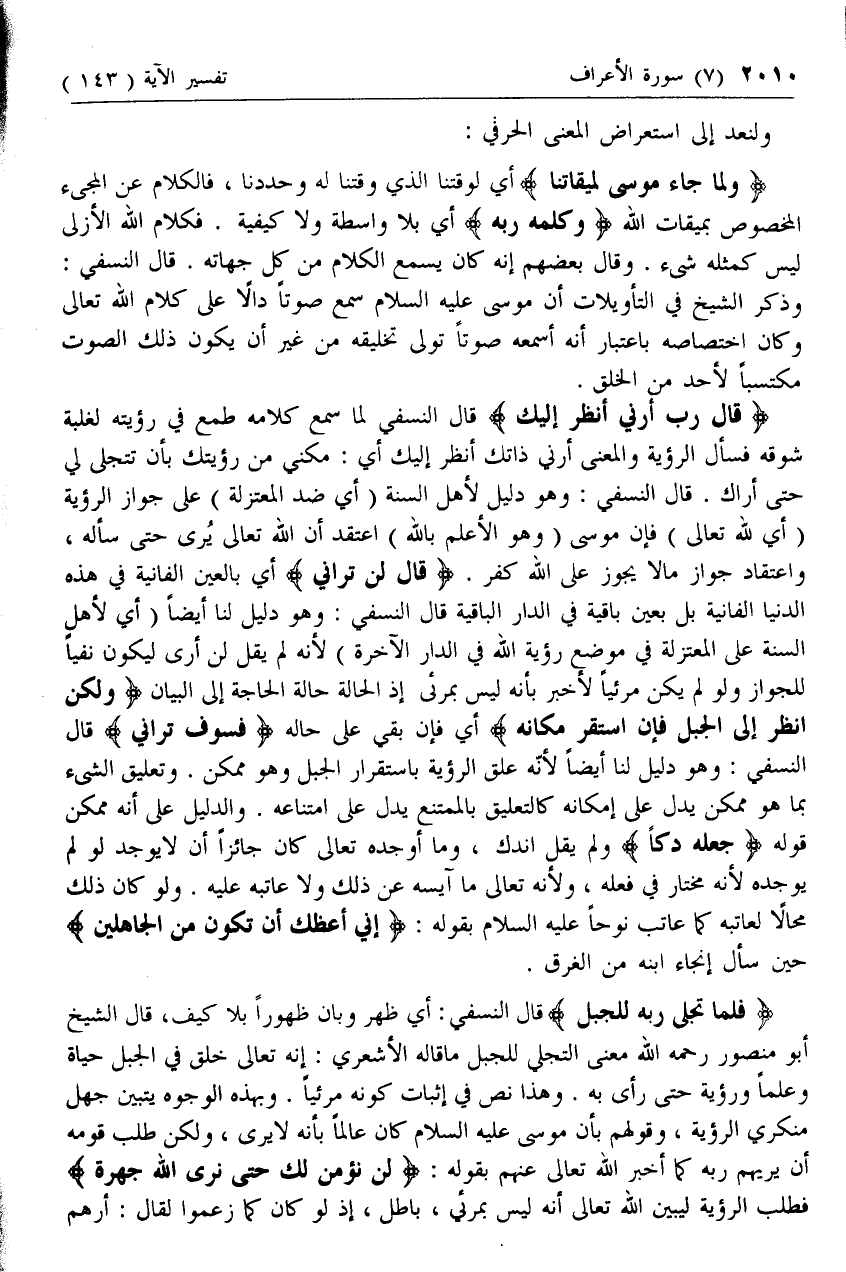 قالَ رَبِّ أَرِنِي أَنْظُرْ إِلَيْكَ قال النسفي لما سمع كلامه طمع في رؤيته لغلبة شوقه فسأل الرؤية والمعنى أرني ذاتك انظر إليك أي: مكني من رؤيتك بأن تتجلى لي حتى أراك. قال النسفي: وهو دليل لأهل السنة (أي ضد المعتزلة) على جواز الرؤية (أي لله تعالى) فإن موسى (وهو الأعلم بالله) اعتقد أن الله تعالى يرى حتى سأله، واعتقاد