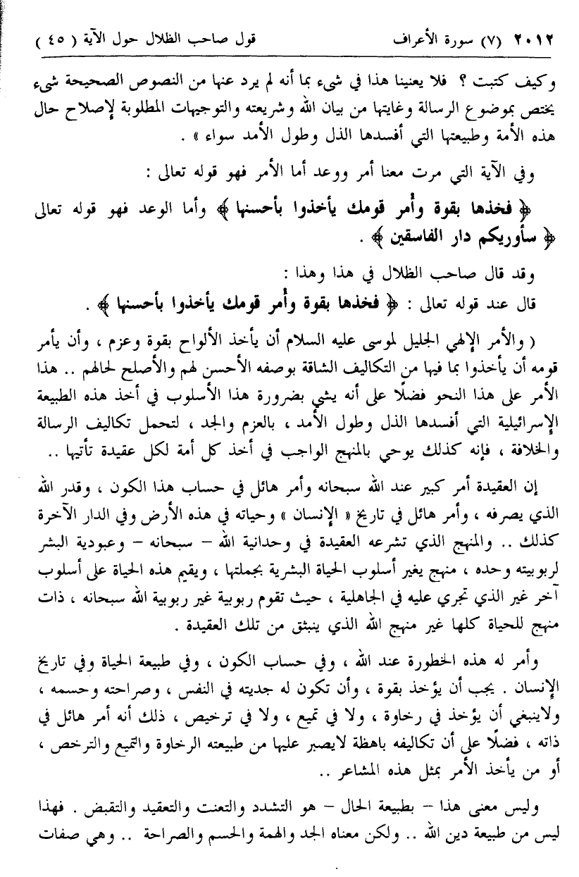 (والأمر الإلهي الجليل لموسى عليه السلام أن يأخذ الألواح بقوة وعزم، وأن يأمر قومه أن يأخذوا بما فيها من التكاليف الشاقة بوصفه الأحسن لهم والأصلح لحالهم .. هذا الأمر على هذا النحو فضلا على أنه يشي بضرورة هذا الأسلوب في أخذ هذه الطبيعة الإسرائيلية التي أفسدها الذل وطول الأمد، بالعزم والجد، لتحمل تكاليف الرسالة والخلافة، فإنه كذلك يوحي بالمنهج الواجب في أخذ كل أمة لكل عقيدة تأتيها ..