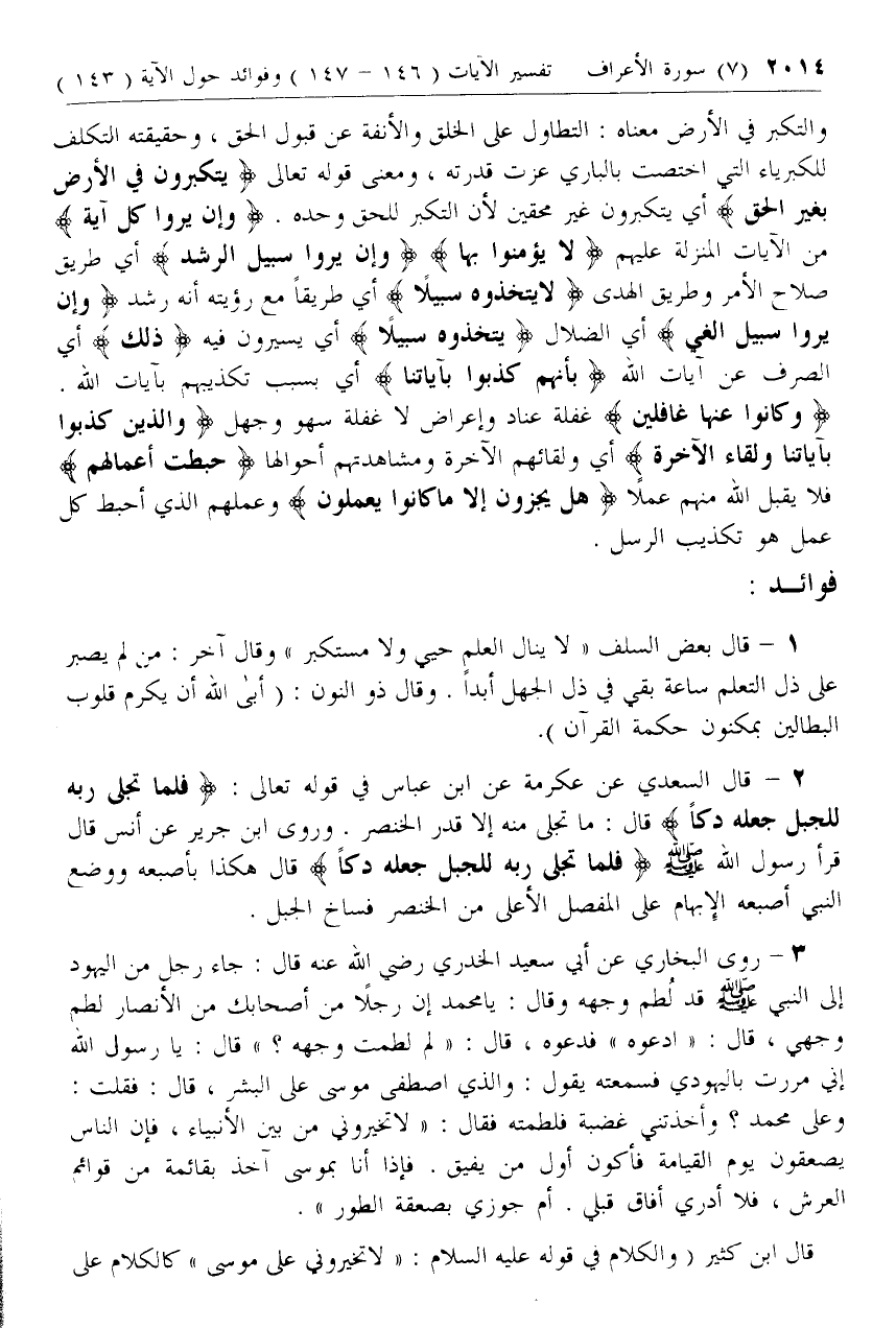 والتكبر في الأرض معناه: التطاول على الخلق والأنفة عن قبول الحق، وحقيقته التكلف للكبرياء التي اختصت بالباري عزت قدرته، ومعنى قوله تعالى يَتَكَبَّرُونَ فِي الْأَرْضِ بِغَيْرِ الْحَقِّ أي يتكبرون غير محقين لأن التكبر للحق وحده. وَإِنْ يَرَوْا كُلَّ آيَةٍ من الآيات المنزلة عليهم لا يُؤْمِنُوا بِها وَإِنْ يَرَوْا سَبِيلَ الرُّشْدِ أي طريق صلاح الأمر وطريق الهدى لا يَتَّخِذُوهُ سَبِيلًا أي طريقا مع رؤيته أنه رشد وَإِنْ يَرَوْا سَبِيلَ الغَيِّ أي الضلال يَتَّخِذُوهُ سَبِيلًا أي يسيرون فيه ذلِكَ أي الصرف عن آيات الله بِأَنَّهُمْ كَذَّبُوا بِآياتِنا أي بسبب تكذيبهم بآيات الله.