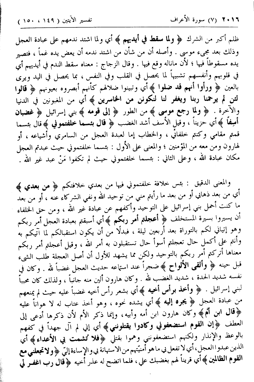 والمعنى الدقيق: بئس خلافة خلفتموني فيها من بعدي خلافتكم مِنْ بَعْدِي أي من بعد ذهابي أو من بعد ما رأيتم مني من توحيد الله ونفي الشركاء عنه، أو من بعد ما كنت أحمل بني إسرائيل على التوحيد وأكفهم عن عبادة غير الله، ومن حق الخلفاء أن يسيروا بسيرة المستخلف أَعَجِلْتُمْ أَمْرَ رَبِّكُمْ أي أسبقتم بعبادة العجل أمر ربكم وهو إتياني لكم بالتوراة بعد أربعين ليلة، فبدلا من أن يكون استقبالكم لما آتيكم به وأنتم على أكمل حال تعجلتم أسوأ حال تستقبلون به أمر الله، وقيل أعجلتم أمر ربكم معناها أتركتم أمر ربكم بالتوحيد ولكن مما يشهد للأول أن أصل العجلة طلب الشئ قبل حينه وَأَلْقَى الْأَلْواحَ ضجرا عند استماعه حديث العجل غضبا لله. وكان في نفسه شديد الحدة، شديد الغضب لله. وكان هارون ألين منه جانبا، ولذلك كان محببا لبني إسرائيل. وَأَخَذَ بِرَأْسِ أَخِيهِ أي بشعر رأس أخيه غضبا عليه حيث لم يمنعهم من عبادة العجل يَجُرُّهُ إِلَيْهِ أي يشده نحوه، وهو أخذ عتاب له لا هوانا عليه قالَ ابْنَ أُمَّ وكان هارون ابن أمه وأبيه، وإنما ذكر الأم لأن ذكرها أدعى إلى العطف إِنَّ الْقَوْمَ اسْتَضْعَفُونِي وَكادُوا يَقْتُلُونَنِي أي إني لم آل جهدا في كفهم بالوعظ والإنذار ولكنهم استضعفونني وهموا بقتلي فَلا تُشْمِتْ بِيَ الْأَعْداءَ أي الذين عبدوا العجل، أي لا تفعل بي ما هو أمنيتهم من الاستهانة بي والإساءة إلي وَلا تَجْعَلْنِي مَعَ الْقَوْمِ الظَّالِمِينَ أي قرينا لهم بغضبك علي، فلما اتضح له عذر أخيه