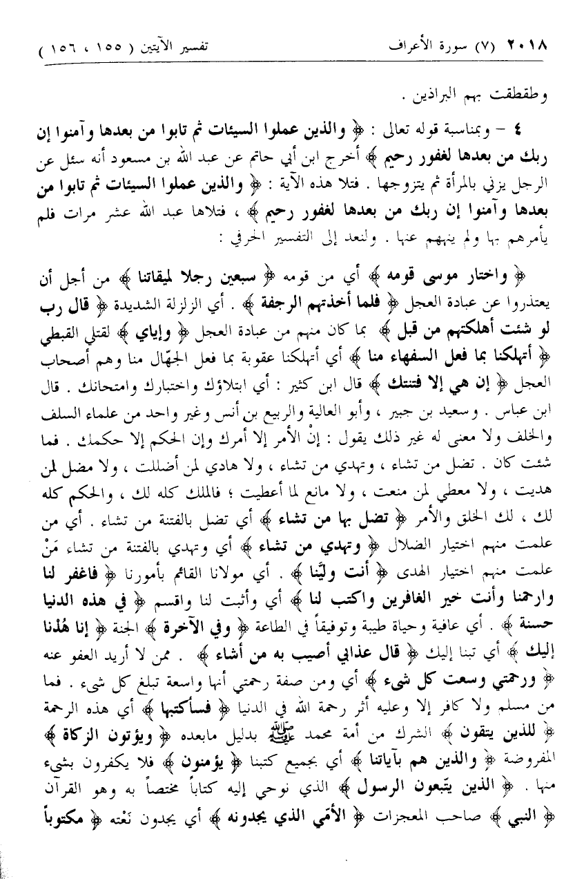 وَاخْتارَ مُوسى قَوْمَهُ أي من قومه سَبْعِينَ رَجُلًا لِمِيقاتِنا من أجل أن يعتذروا عن عبادة العجل فَلَمَّا أَخَذَتْهُمُ الرَّجْفَةُ. أي الزلزلة الشديدة قالَ رَبِّ لَوْ شِئْتَ أَهْلَكْتَهُمْ مِنْ قَبْلُ بما كان منهم من عبادة العجل وَإِيَّايَ لقتلي القبطي أَتُهْلِكُنا بِما فَعَلَ السُّفَهاءُ مِنَّا أي أتهلكنا عقوبة بما فعل الجهال منا وهم أصحاب العجل إِنْ هِيَ إِلَّا فِتْنَتُكَ قال ابن كثير: أي ابتلاؤك واختبارك وامتحانك. قال ابن عباس. وسعيد بن جبير، وأبو العالية والربيع بن أنس وغير واحد من علماء السلف والخلف ولا معنى له غير ذلك يقول: إن الأمر إلا أمرك وإن الحكم إلا حكمك. فما شئت كان. تضل من تشاء، وتهدي من تشاء، ولا هادي لمن أضللت، ولا مضل لمن هديت، ولا معطي لمن منعت، ولا مانع لما أعطيت؛ فالملك كله لك، والحكم كله لك، لك الخلق والأمر تُضِلُّ بِها مَنْ تَشاءُ أي تضل بالفتنة من تشاء. أي من علمت منهم اختيار الضلال وَتَهْدِي مَنْ تَشاءُ أي وتهدي بالفتنة من تشاء من علمت منهم اختيار الهدى أَنْتَ وَلِيُّنا. أي مولانا القائم بأمورنا فَاغْفِرْ لَنا وَارْحَمْنا وَأَنْتَ خَيْرُ الْغافِرِينَ
