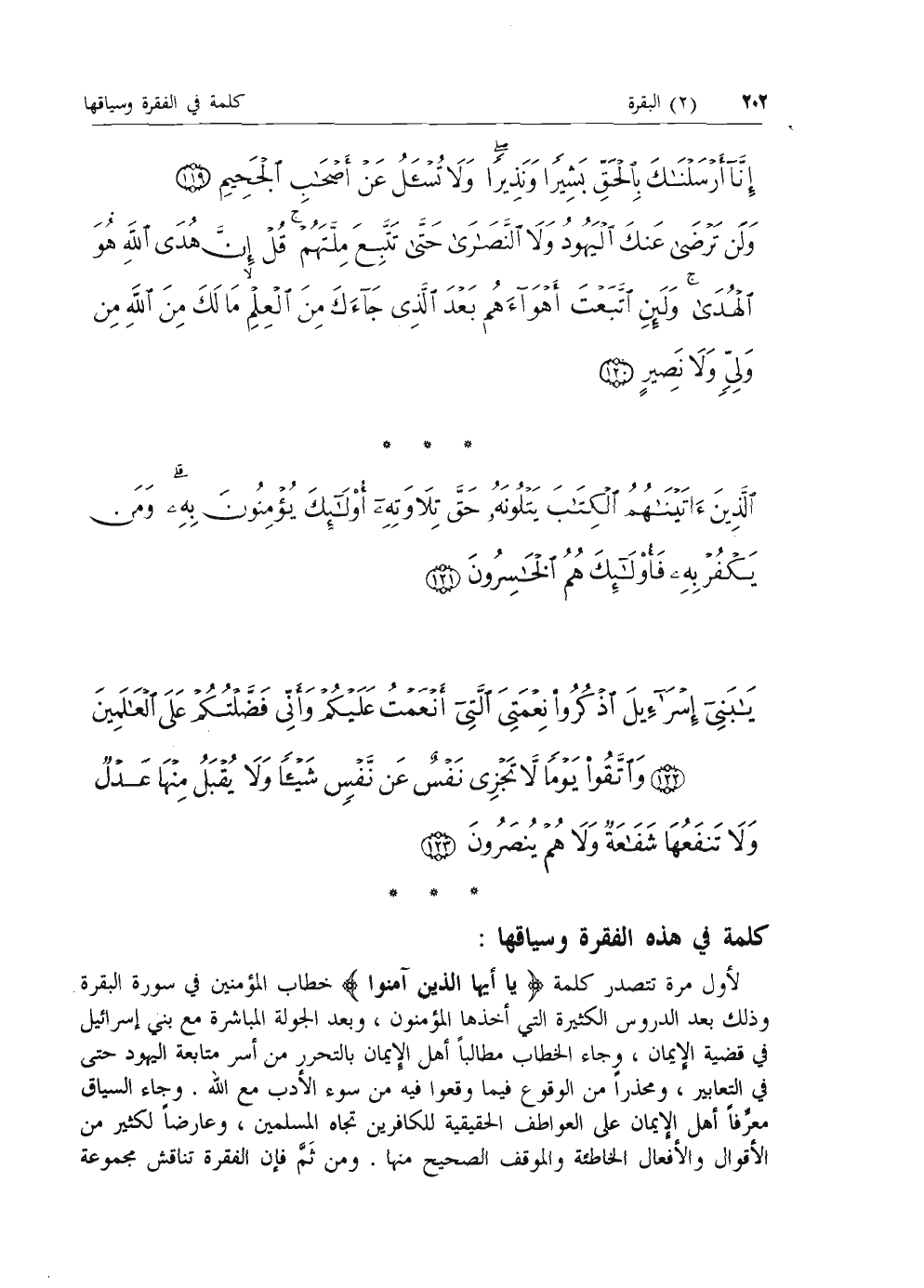 لأول مرة تتصدر كلمة يا أَيُّهَا الَّذِينَ آمَنُوا خطاب المؤمنين في سورة البقرة وذلك بعد الدروس الكثيرة التي أخذها المؤمنون، وبعد الجولة المباشرة مع بني إسرائيل في قضية الإيمان، وجاء الخطاب مطالبا أهل الإيمان بالتحرر من أسر متابعة اليهود حتى في التعابير، ومحذرا من الوقوع فيما وقعوا فيه من سوء الأدب مع الله. وجاء السياق معرفا أهل الإيمان على العواطف الحقيقة للكافرين تجاه المسلمين، وعارضا لكثير من الأقوال والأفعال الخاطئة والموقف الصحيح منها. ومن ثم فإن الفقرة تناقش مجموعة