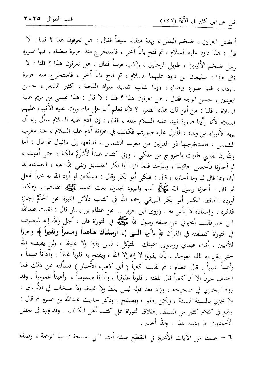 أخفش العينين، ضخم البطن، ربعة متقلد سيفا فقال: هل تعرفون هذا؟ قلنا: لا قال: هذا داود عليه السلام، ثم فتح بابا آخر، فاستخرج منه حريرة بيضاء، فيها صورة رجل ضخم الأليتين، طويل الرجلين، راكب فرسا فقال: هل تعرفون هذا؟ قلنا: لا قال هذا: سليمان بن داود عليهما السلام، ثم فتح بابا آخر، فاستخرج منه حريرة سوداء، فيها صورة بيضاء، وإذا شاب شديد سواد اللحية، كثير الشعر، حسن العينين، حسن الوجه فقال: هل تعرفون هذا؟ قلنا: لا قال: هذا عيسى بن مريم عليه السلام، قلنا: من أين لك هذه الصور؟ لأنا نعلم أنها على ما صورت عليه الأنبياء عليهم السلام لأنا رأينا صورة نبينا عليه السلام مثله، فقال: إن آدم عليه السلام سأل ربه أن يريه الأنبياء من ولده، فأنزل عليه صورهم فكانت في خزانة آدم عليه السلام، عند مغرب الشمس، فاستخرجها ذو القرنين من مغرب الشمس، فدفعها إلى دانيال ثم قال: أما والله إن نفسي طابت بالخروج من ملكي، وإني كنت عبدا لأشركم ملكة، حتى أموت، ثم أجازنا فأحسن جائزتنا، وسرحنا فلما أتينا أبا بكر الصديق رضي الله عنه، فحدثناه بما أرانا وبما قال لنا وما أجازنا، قال: فبكى أبو بكر وقال: مسكين لو أراد الله به خيرا لفعل ثم قال: أخبرنا رسول الله صلى الله عليه وسلم أنهم واليهود يجدون نعت محمد صلى الله عليه وسلم عندهم. وهكذا أورده الحافظ الكبير أبو بكر البيهقي رحمه الله في كتاب دلائل النبوة عن الحاكم إجازة فذكره، وإسناده لا بأس به. وروى ابن جرير .. عن عطاء بن يسار قال: لقيت عبد الله ابن عمر فقلت أخبرني عن صفة رسول الله صلى الله عليه وسلم في التوراة قال: أجل والله إنه لموصوف في التوراة كصفته في القرآن يا أَيُّهَا النَّبِيُّ إِنَّا أَرْسَلْناكَ شاهِداً وَمُبَشِّراً وَنَذِيراً وحرزا للأميين، أنت عبدي ورسولي سميتك المتوكل، ليس بفظ ولا غليظ، ولن يقبضه الله حتى يقيم به الملة العوجاء، بأن يقولوا لا إله إلا الله، ويفتح به قلوبا غلفا، وآذانا صما، وأعينا عميا. قال عطاء: ثم لقيت كعبا (أي كعب الأحبار) فسألته عن ذلك فما اختلف حرفا إلا أن كعبا قال بلغته، قلوبا غلوفيا، وآذانا صموميا، وأعينا عموميا. وقد رواه البخاري في صحيحه، وزاد بعد قوله ليس بفظ ولا غليظ ولا صخاب في الأسواق، ولا يجزي بالسيئة السيئة، ولكن يعفو، ويصفح، وذكر حديث عبد الله بن عمرو ثم قال:
