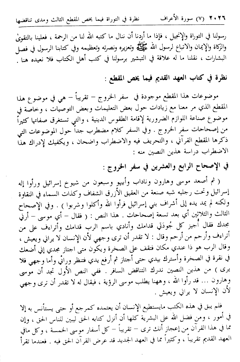(ثم أصعد موسى وهارون وناداب وأبيهو وسبعون من شيوخ إسرائيل ورأوا إله إسرائيل وتحت رجليه شبه صنعة من العقيق الأزرق الشفاف وكذات السماء في النقاوة ولكنه لم يمد يده إلى أشراف بني إسرائيل فرأوا الله وأكلوا وشربوا). وفي الإصحاح الثالث والثلاثين أي بعد تسعة إصحاحات. هذا النص: (فقال- أي موسى- أرني مجدك فقال أجيز كل جودتي قدامك وأنادي باسم الرب قدامك وأتراءف على من أتراءف وأرحم من أرحم وقال: لا تقدر أن ترى وجهي لأن الإنسان لا يراني ويعيش، وقال الرب هو ذا عندي مكان فتقف على الصخرة ويكون متى اجتاز مجدي إني أضعك في نقرة في الصخرة وأسترك بيدي حتى أجتاز ثم أرفع يدي فتنظر ورائي وأما وجهي فلا يرى) من هذين النصين ندرك التناقض السافر. ففي النص الأول تجد أن موسى وهارون ... قد رأوا الله، وهاهنا يطلب موسى الرؤية، فيقال له لا تقدر أن ترى وجهي لأن الإنسان لا يراني ويعيش.