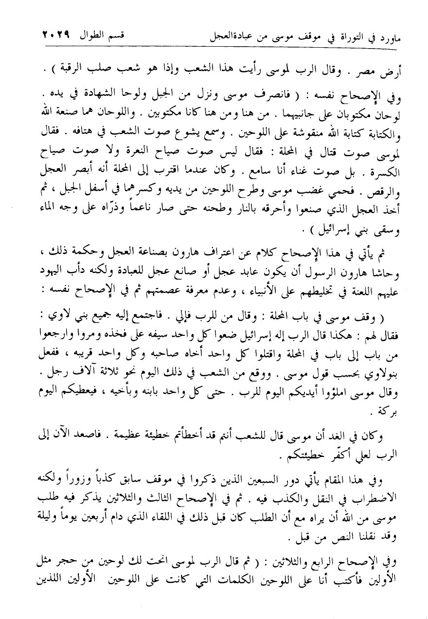 لوحان مكتوبان على جانبيهما. من هنا ومن هنا كانا مكتوبين. واللوحان هما صنعة الله والكتابة كتابة الله منقوشة على اللوحين. وسمع يشوع صوت الشعب في هتافه. فقال لموسى صوت قتال في المحلة: فقال ليس صوت صياح النعرة ولا صوت صياح الكسرة. بل صوت غناء أنا سامع. وكان عند ما اقترب إلى المحلة أنه أبصر العجل والرقص. فحمي غضب موسى وطرح اللوحين من يديه وكسرهما في أسفل الجبل، ثم أخذ العجل الذي صنعوا وأحرقه بالنار وطحنه حتى صار ناعما وذراه على وجه