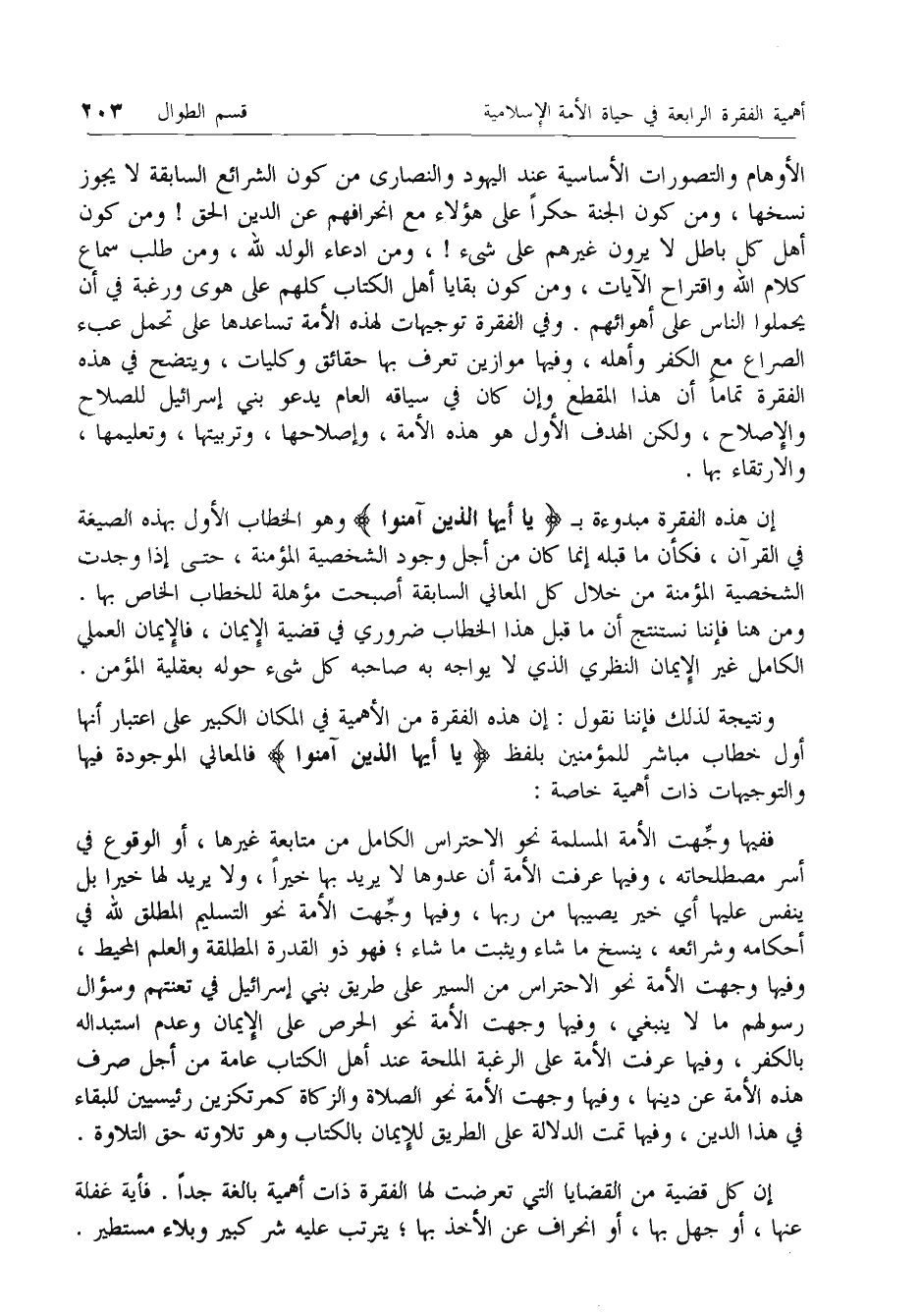 الأوهام والتصورات الأساسية عند اليهود والنصارى من كون الشرائع السابقة لا يجوز نسخها، ومن كون الجنة حكرا على هؤلاء مع انحرافهم عن الدين الحق! ومن كون أهل كل باطل لا يرون غيرهم على شئ!، ومن ادعاء الولد لله، ومن طلب سماع كلام الله واقتراح الآيات، ومن كون بقايا أهل الكتاب كلهم على هوى ورغبة في أن يحملوا الناس على أهوائهم. وفي الفقرة توجيهات لهذه الأمة تساعدها على تحمل عبء الصراع مع الكفر وأهله، وفيها موازين تعرف بها حقائق وكليات، ويتضح في هذه الفقرة تماما أن هذا المقطع وإن كان في سياقه العام يدعو بني إسرائيل للصلاح والإصلاح، ولكن الهدف الأول هو هذه الأمة، وإصلاحها، وتربيتها، وتعليمها، والارتقاء بها.