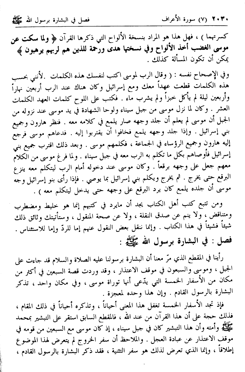 فإذ تجد الأسفار الخمسة تغفل هذا المعنى أحيانا، وتذكره أحيانا في ذلك المقام، فذلك حجة على أن هذا القرآن من عند الله، فالمقطع السابق استقر على التبشير بمحمد صلى الله عليه وسلم وأمته وأن هذا التبشير كان في جبل سيناء، إذ كان موسى مع السبعين من قومه في موقف الاعتذار عن عبادة العجل. والملاحظ أن سفر الخروج لم يتعرض لهذا الموضوع إطلاقا، وإنما الذي تعرض لذلك هو سفر التثنية، فقد ذكر البشارة بالرسول القادم،