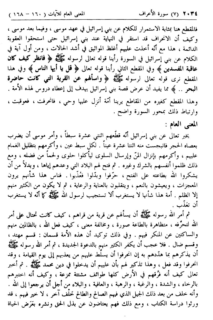 فالمقطع هنا بمثابة الاستمرار للكلام عن بني إسرائيل في عهد موسى، وفيما بعد موسى، وكيف أن الانحراف قد استقر في النهاية عند بني إسرائيل حتى استحقوا العقوبة الدائمة، هذا مع أنه أخذت عليهم أغلظ المواثيق في أشد الحالات، ومن أول آية في الكلام عن بني إسرائيل في السورة رأينا قوله تعالى لرسوله صلى الله عليه وسلم فَانْظُرْ كَيْفَ كانَ عاقِبَةُ الْمُفْسِدِينَ وفي المقطع الثاني رأينا قوله تعالى قُلْ يا أَيُّهَا النَّاسُ وفي هذا المقطع نرى قوله تعالى لرسوله صلى الله عليه وسلم وَسْئَلْهُمْ عَنِ الْقَرْيَةِ الَّتِي كانَتْ حاضِرَةَ الْبَحْرِ .. مما يفيد أن عرض قصة بني إسرائيل يهدف إلى إعطاء دروس لهذه الأمة.