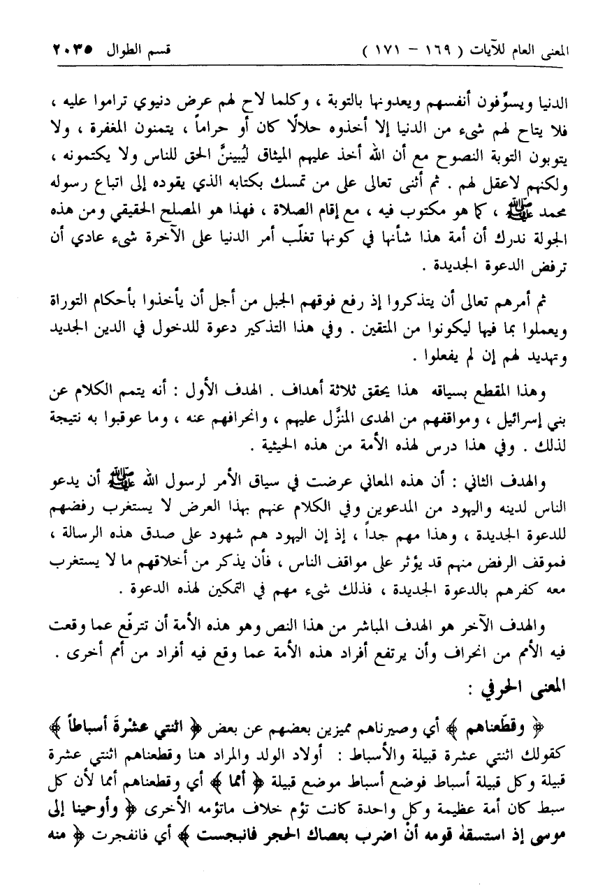وهذا المقطع بسياقه هذا يحقق ثلاثة أهداف. الهدف الأول: أنه يتمم الكلام عن بني إسرائيل، ومواقفهم من الهدى المنزل عليهم، وانحرافهم عنه، وما عوقبوا به نتيجة لذلك. وفي هذا درس لهذه الأمة من هذه الحيثية.