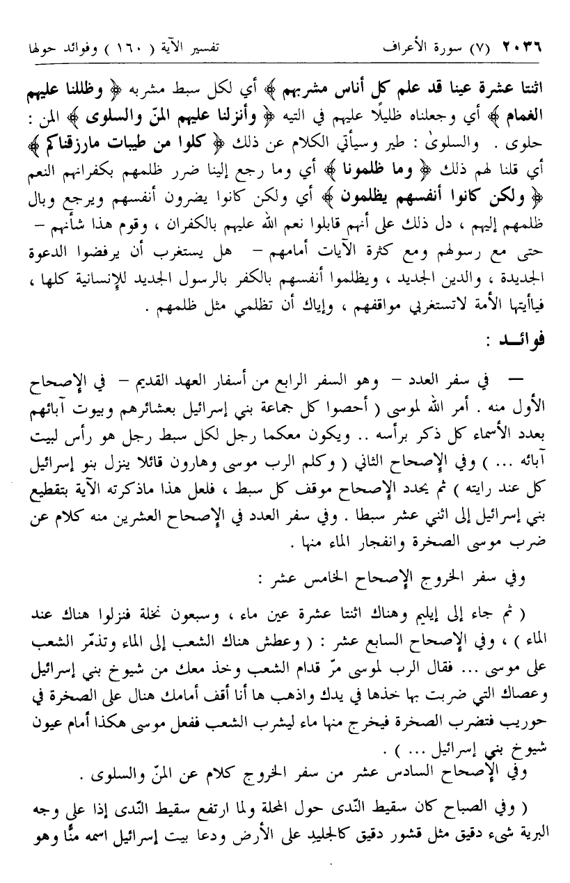 اثْنَتا عَشْرَةَ عَيْناً قَدْ عَلِمَ كُلُّ أُناسٍ مَشْرَبَهُمْ أي لكل سبط مشربه وَظَلَّلْنا عَلَيْهِمُ الْغَمامَ أي وجعلناه ظليلا عليهم في التيه وَأَنْزَلْنا عَلَيْهِمُ الْمَنَّ وَالسَّلْوى المن: