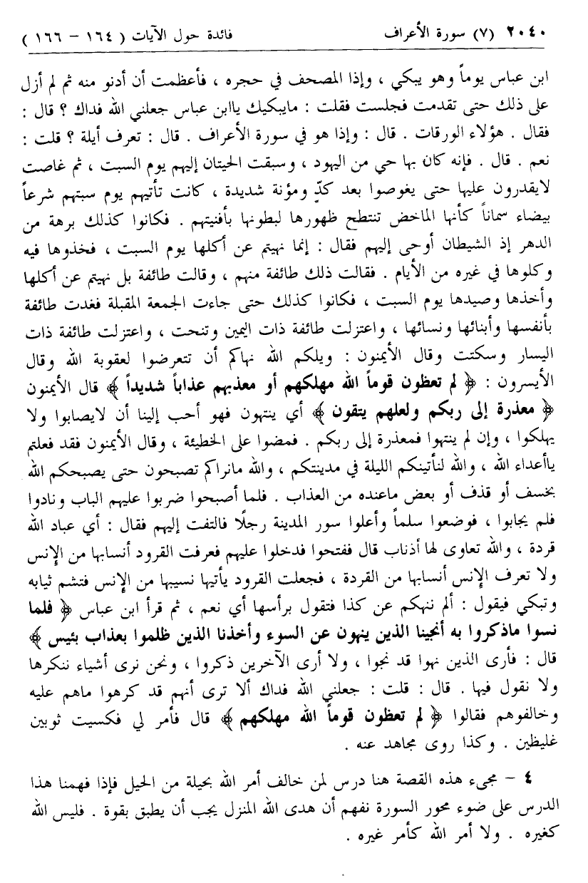نعم. قال. فإنه كان بها حي من اليهود، وسبقت الحيتان إليهم يوم السبت، ثم غاصت لا يقدرون عليها حتى يغوصوا بعد كد ومئونة شديدة، كانت تأتيهم يوم سبتهم شرعا بيضاء سمانا كأنها الماخض تنتطح ظهورها لبطونها بأفنيتهم. فكانوا كذلك برهة من الدهر إذ الشيطان أوحى إليهم فقال: إنما نهيتم عن أكلها يوم السبت، فخذوها فيه وكلوها في غيره من الأيام. فقالت ذلك طائفة منهم، وقالت طائفة بل نهيتم عن أكلها وأخذها وصيدها يوم السبت، فكانوا كذلك حتى جاءت الجمعة المقبلة فغدت طائفة بأنفسها وأبنائها ونسائها، واعتزلت طائفة ذات اليمين وتنحت، واعتزلت طائفة ذات اليسار وسكتت وقال الأيمنون: ويلكم الله نهاكم أن تتعرضوا لعقوبة الله وقال الأيسرون: لِمَ تَعِظُونَ قَوْماً اللَّهُ مُهْلِكُهُمْ أَوْ مُعَذِّبُهُمْ عَذاباً شَدِيداً قال الأيمنون مَعْذِرَةً إِلى رَبِّكُمْ وَلَعَلَّهُمْ يَتَّقُونَ أي ينتهون فهو أحب إلينا أن لا يصابوا ولا يهلكوا، وإن لم ينتهوا فمعذرة إلى ربكم. فمضوا على الخطيئة، وقال الأيمنون فقد فعلتم يا أعداء الله، والله لنأتينكم الليلة في مدينتكم، والله ما نراكم تصبحون حتى يصبحكم الله بخسف أو قذف أو بعض ما عنده من العذاب. فلما أصبحوا ضربوا عليهم الباب ونادوا فلم يجابوا، فوضعوا سلما وأعلوا سور المدينة رجلا فالتفت إليهم فقال: أي عباد الله قردة، والله تعاوى لها أذناب قال ففتحوا فدخلوا عليهم فعرفت القرود أنسابها من الإنس ولا تعرف الإنس أنسابها من القردة، فجعلت القرود يأتيها نسيبها من الإنس فتشم ثيابه وتبكي فيقول: ألم ننهكم عن كذا فتقول برأسها أي نعم، ثم قرأ ابن عباس فَلَمَّا نَسُوا ما ذُكِّرُوا بِهِ أَنْجَيْنَا الَّذِينَ يَنْهَوْنَ عَنِ السُّوءِ وَأَخَذْنَا الَّذِينَ ظَلَمُوا بِعَذابٍ بَئِيسٍ قال: فأرى الذين نهوا قد نجوا، ولا أرى الآخرين ذكروا، ونحن نرى أشياء ننكرها ولا نقول فيها. قال: قلت: جعلني الله فداك ألا ترى أنهم قد كرهوا ما هم عليه وخالفوهم فقالوا لِمَ تَعِظُونَ قَوْماً اللَّهُ مُهْلِكُهُمْ قال فأمر لي فكسيت ثوبين غليظين. وكذا روى مجاهد عنه.