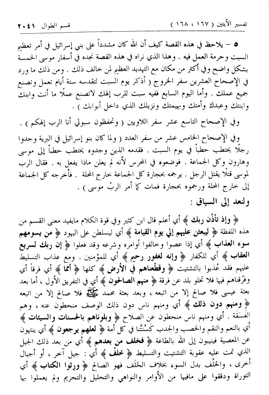 وَإِذْ تَأَذَّنَ رَبُّكَ أي أعلم قال ابن كثير وفي قوة الكلام ما يفيد معنى القسم من هذه اللفظة لَيَبْعَثَنَّ عَلَيْهِمْ إِلى يَوْمِ الْقِيامَةِ أي ليسلطن على اليهود مَنْ يَسُومُهُمْ سُوءَ الْعَذابِ أي إذا عصوا وخالفوا أوامره وشرعه وقد فعلوا إِنَّ رَبَّكَ لَسَرِيعُ الْعِقابِ أي للكفار وَإِنَّهُ لَغَفُورٌ رَحِيمٌ أي للمؤمنين. ومع عذاب التسليط عليهم فقد عذبوا بالتشتيت