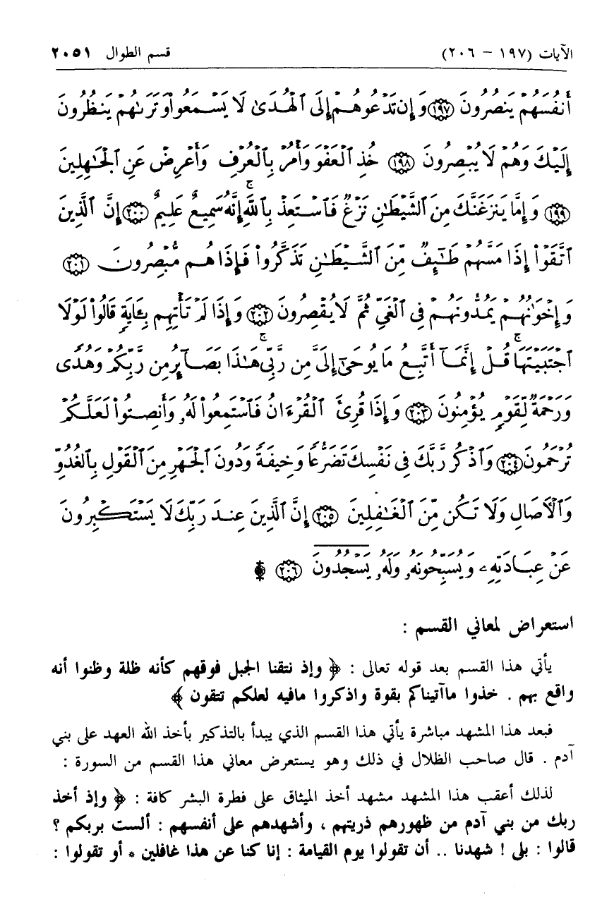 فبعد هذا المشهد مباشرة يأتي هذا القسم الذي يبدأ بالتذكير بأخذ الله العهد على بني آدم. قال صاحب الظلال في ذلك وهو يستعرض معاني هذا القسم من السورة: