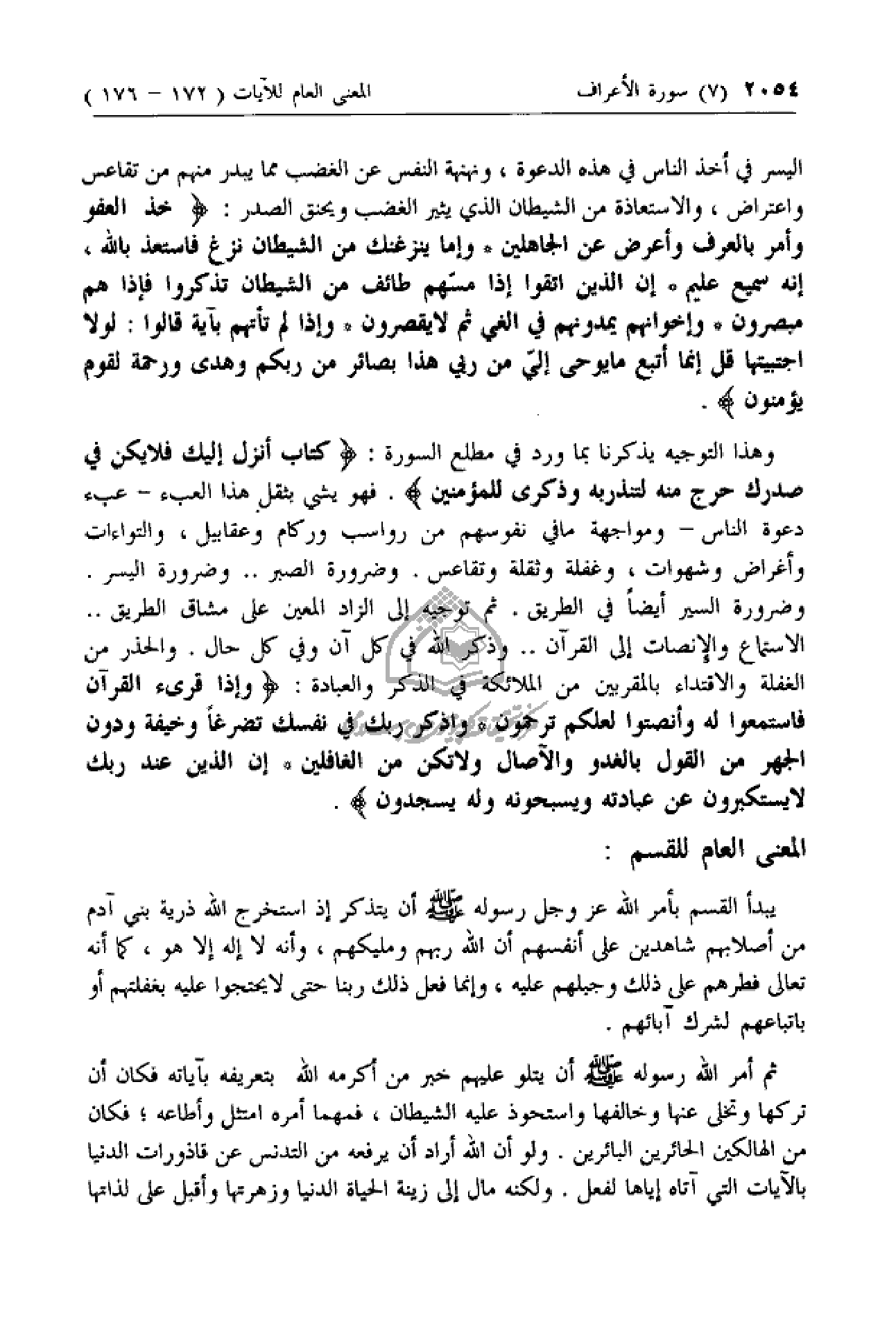 يبدأ القسم بأمر الله عزّ وجل رسوله صلى الله عليه وسلم أن يتذكر إذ استخرج الله ذرية بني آدم من أصلابهم شاهدين على أنفسهم أن الله ربهم ومليكهم، وأنه لا إله إلا هو، كما أنه تعالى فطرهم على ذلك وجبلهم عليه، وإنما فعل ذلك ربنا حتى لا يحتجوا عليه بغفلتهم أو باتباعهم لشرك آبائهم.