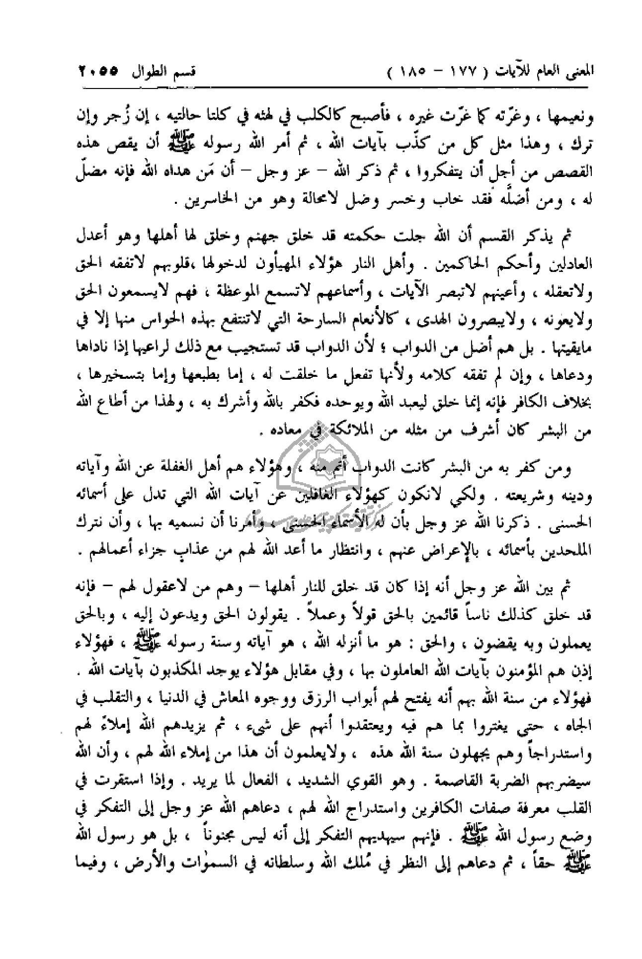 ثم يذكر القسم أن الله جلت حكمته قد خلق جهنم وخلق لها أهلها وهو أعدل العادلين وأحكم الحاكمين. وأهل النار هؤلاء المهيئون لدخولها، قلوبهم لا تفقه الحق ولا تعقله، وأعينهم لا تبصر الآيات، وأسماعهم لا تسمع الموعظة، فهم لا يسمعون الحق ولا يعونه، ولا يبصرون الهدى، كالأنعام السارحة التي لا تنتفع بهذه الحواس منها إلا في ما يقيتها. بل هم أضل من الدواب؛ لأن الدواب قد تستجيب مع ذلك لراعيها إذا ناداها ودعاها، وإن لم تفقه كلامه ولأنها تفعل ما خلقت له، إما بطبعها وإما بتسخيرها، بخلاف الكافر فإنه إنما خلق ليعبد الله ويوحده فكفر بالله وأشرك به، ولهذا من أطاع الله من البشر كان أشرف من مثله من الملائكة في معاده.