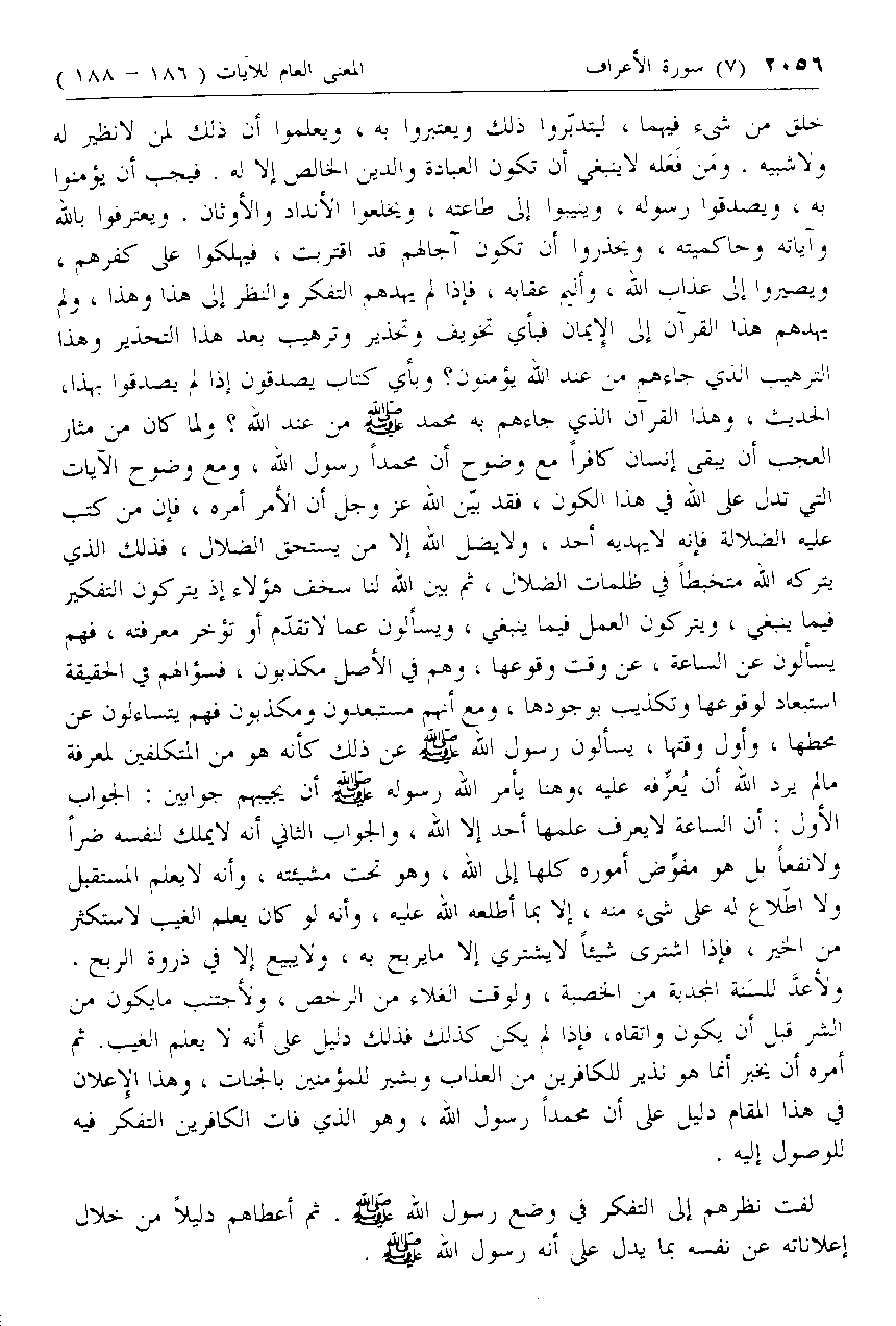 خلق من شئ فيهما، ليتدبروا ذلك ويعتبروا به، ويعلموا أن ذلك لمن لا نظير له ولا شبيه. ومن فعله لا ينبغي أن تكون العبادة والدين الخالص إلا له. فيجب أن يؤمنوا به، ويصدقوا رسوله، وينيبوا إلى طاعته، ويخلعوا الأنداد والأوثان. ويعترفوا بالله وآياته وحاكميته، ويحذروا أن تكون آجالهم قد اقتربت، فيهلكوا على كفرهم، ويصيروا إلى عذاب الله، وأليم عقابه، فإذا لم يهدهم التفكر والنظر إلى هذا وهذا، ولم يهدهم هذا القرآن إلى الإيمان فبأي تخويف وتحذير وترهيب بعد هذا التحذير وهذا الترهيب الذي جاءهم من عند الله يؤمنون؟ وبأي كتاب يصدقون إذا لم يصدقوا بهذا، الحديث، وهذا القرآن الذي جاءهم به محمد صلى الله عليه وسلم من عند الله؟ ولما كان من مثار العجب أن يبقى إنسان كافرا مع وضوح أن محمدا رسول الله، ومع وضوح الآيات التي تدل على الله في هذا الكون، فقد بين الله عزّ وجل أن الأمر أمره، فإن من كتب عليه الضلالة فإنه لا يهديه أحد، ولا يضل الله إلا من يستحق الضلال، فذلك الذي يتركه الله متخبطا في ظلمات الضلال، ثم بين الله لنا سخف هؤلاء إذ يتركون التفكير فيما ينبغي، ويتركون العمل فيما ينبغي، ويسألون عما لا تقدم أو تؤخر معرفته، فهم يسألون عن الساعة، عن وقت وقوعها، وهم في الأصل مكذبون، فسؤالهم في الحقيقة استبعاد لوقوعها وتكذيب بوجودها، ومع أنهم مستبعدون ومكذبون فهم يتساءلون عن محطها، وأول وقتها، يسألون رسول الله صلى الله عليه وسلم عن ذلك كأنه هو من المتكلفين لمعرفة ما لم يرد الله أن يعرفه عليه، وهنا يأمر الله رسوله صلى الله عليه وسلم أن يجيبهم جوابين: الجواب الأول: أن الساعة لا يعرف علمها أحد إلا الله، والجواب الثاني أنه لا يملك لنفسه ضرا ولا نفعا بل هو مفوض أموره كلها إلى الله، وهو تحت مشيئته، وأنه لا يعلم المستقبل ولا اطلاع له على شئ منه، إلا بما أطلعه الله عليه، وأنه لو كان يعلم الغيب لاستكثر من الخير، فإذا اشترى شيئا لا يشتري إلا ما يربح به، ولا يبيع إلا في ذروة الربح.